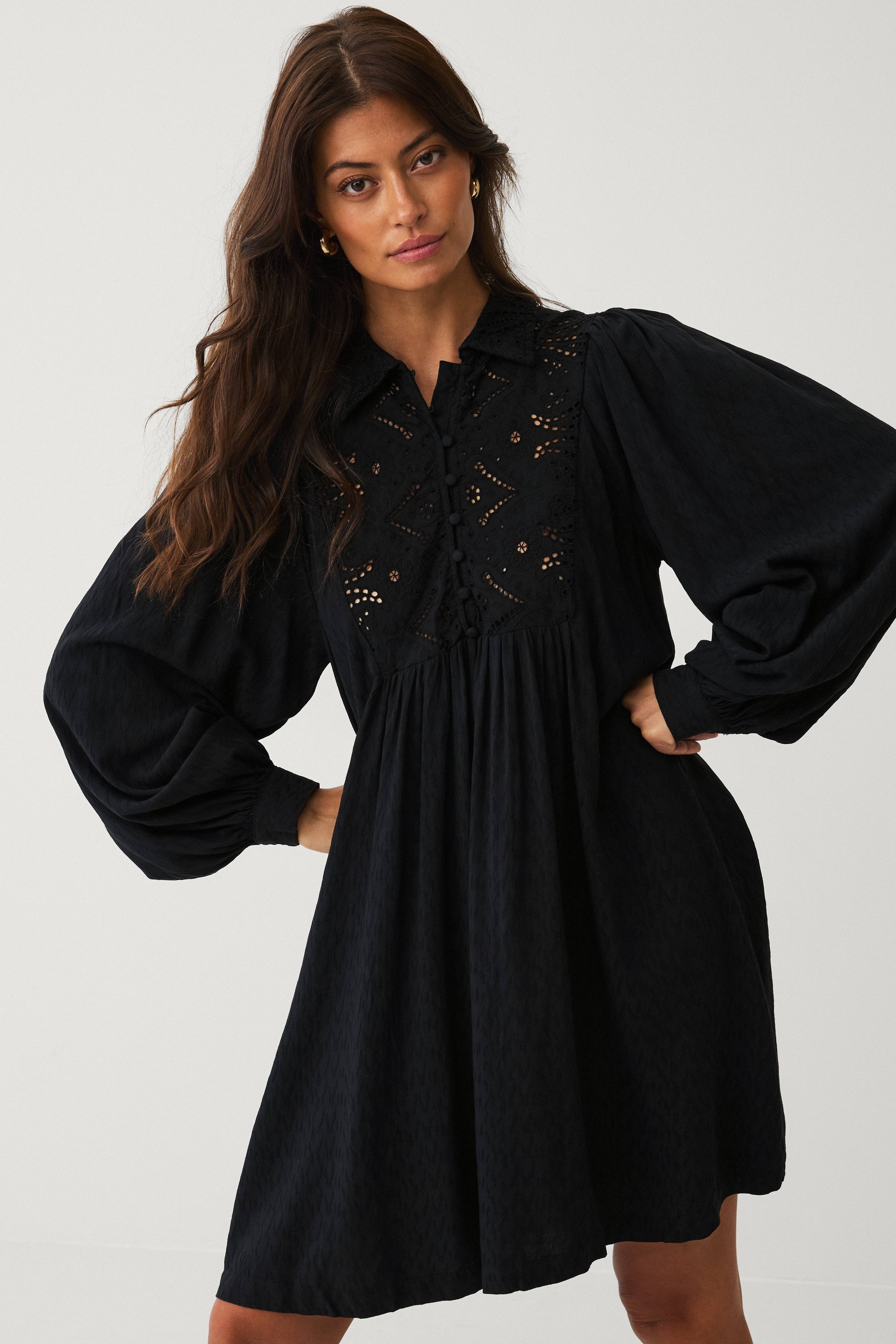• Tynd kjole i viskose med struktur• Linning i blonde med knapstolpe foran• Krave i blonde• Lange ærmer med tynde manchetter• Længde: cm i størrelse