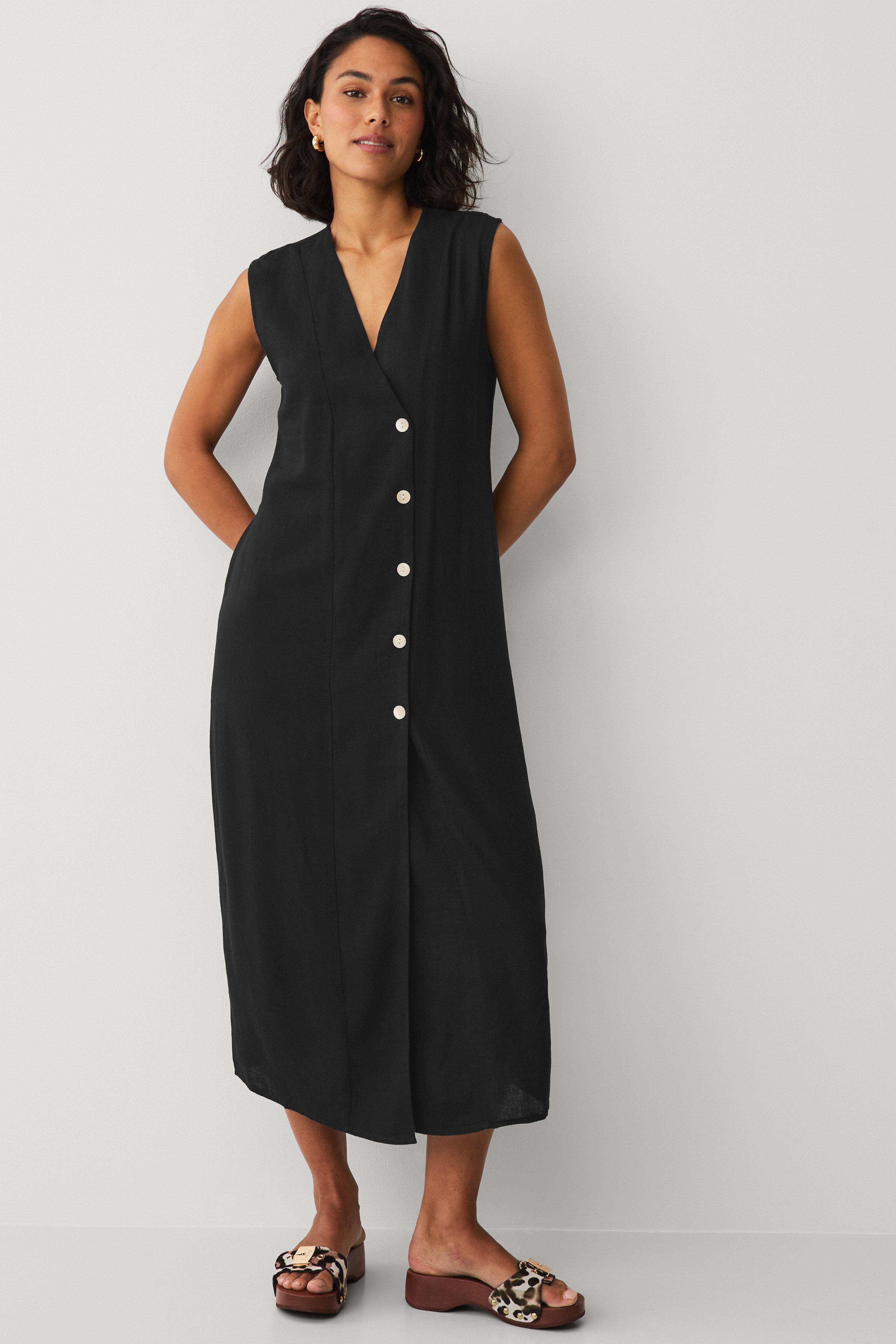 • Lang, ærmeløs model i hørblanding• V-formet halsudskæring• Knapper foran• Slids nede foran• Længde: 128 cm i størrelse 36