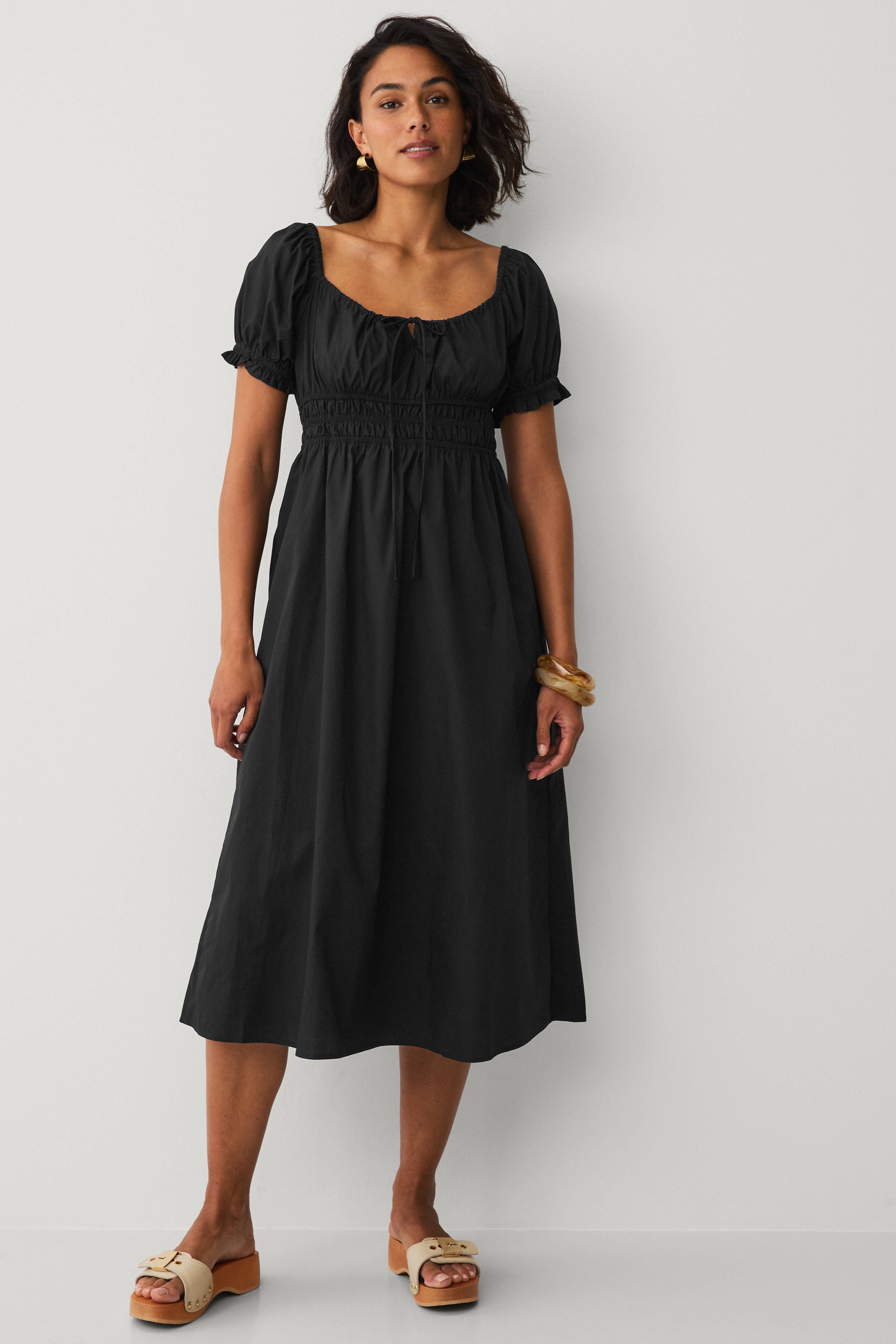 • Figurformede model med elastik ved taljen • Halsudskæring med træksnørre og elastik i nakken og over skuldrene • Kort, raglan-skåret ærme med elastik nederst • Længde: 118 cm i størrelse 36