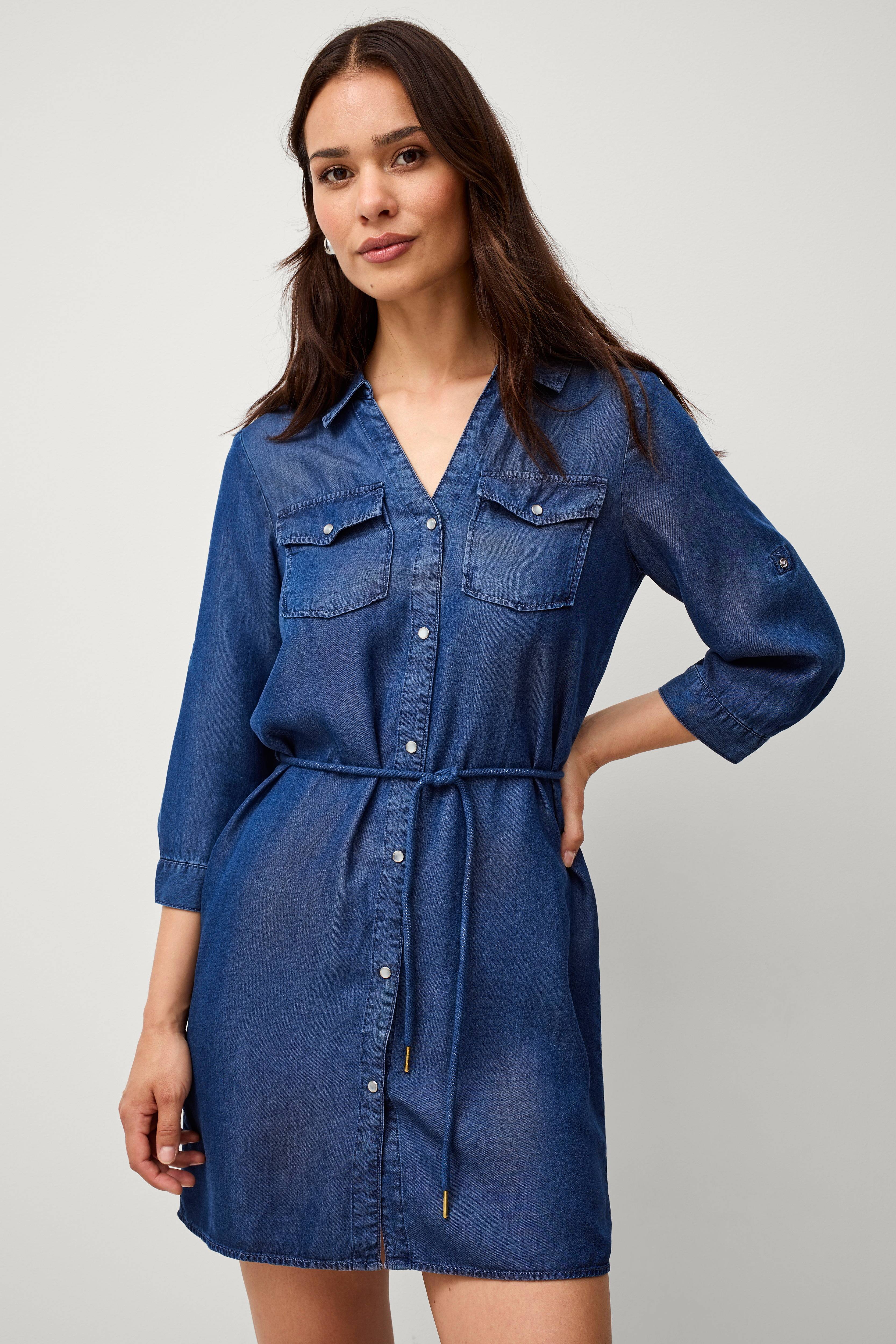 • Kjole i blød lyocell med et denimlook• Trykknapper med perlemorslook hele vejen frem• To brystlommer med knapbare lommelåg• Aftageligt, tyndt bindebælte ved taljen• 3/4 lange ærmer med oprullet• Længde: 93 cm i størrelse 36