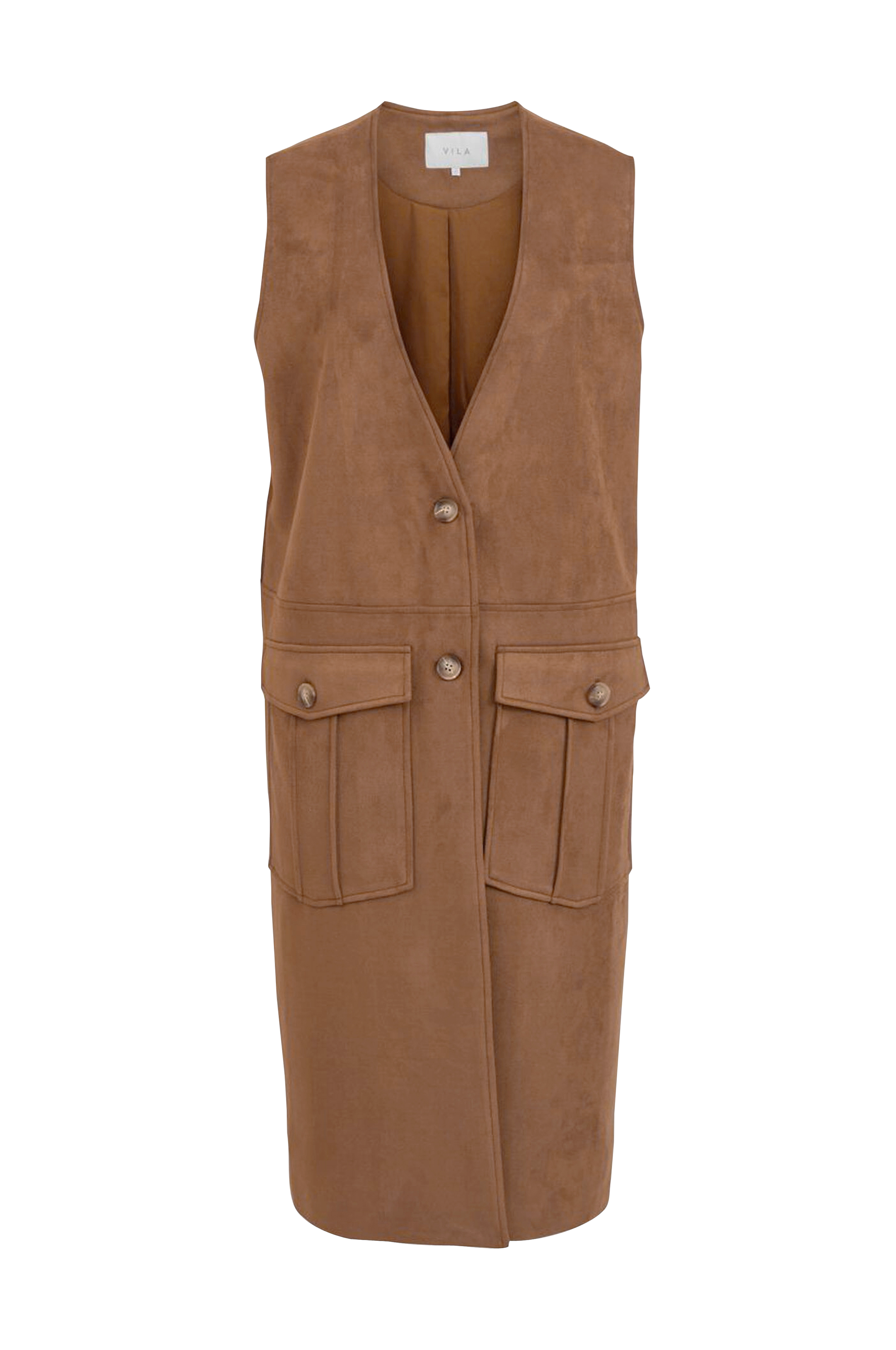 Lang vest i blødt imiteret ruskind med let stretch. V-udskæring og to knapper foran. Store forlommer med klap og knap. Foret. Længde ca. 105 cm i str. 36.