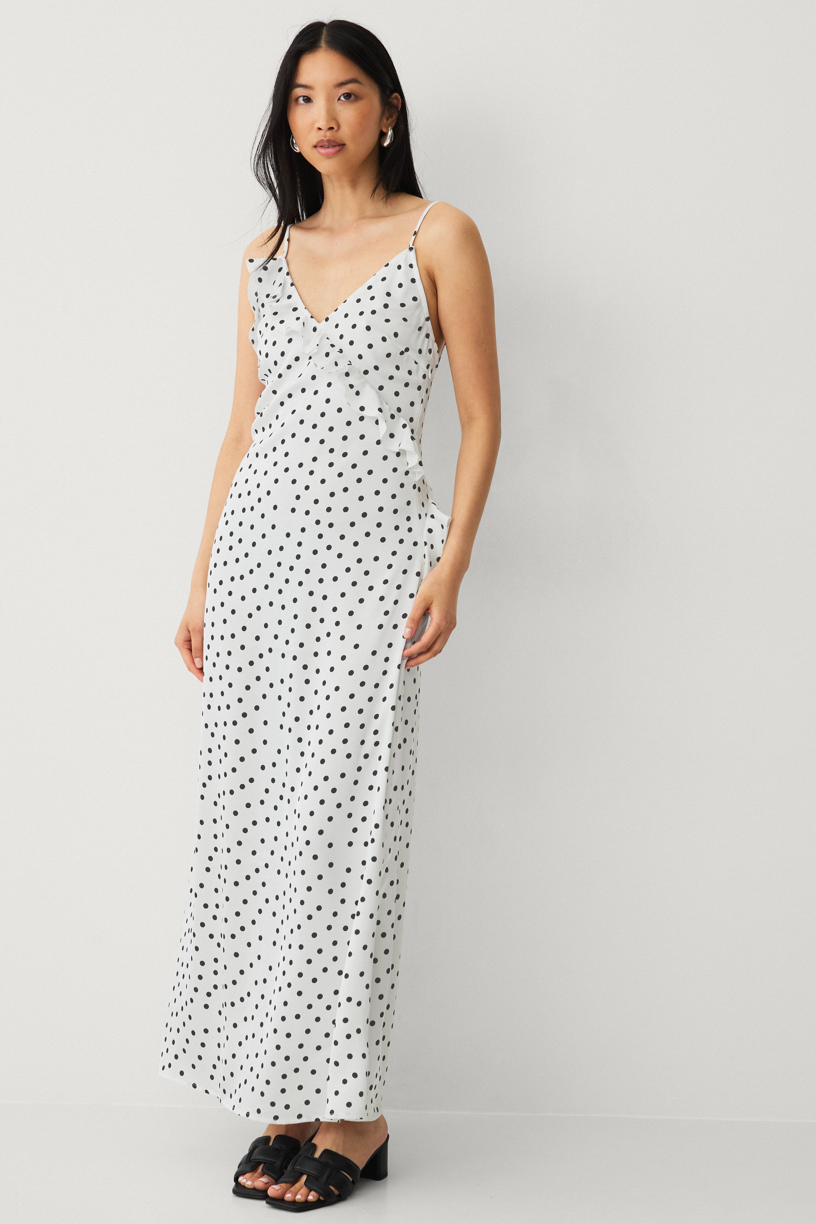 • Ærmeløs model med svaj i satin• V-udskæring i halsen og i nakken• Lille volant rundt om oventil• Tynde, justérbare skulderstropper• Længde: 137 cm i størrelse 36