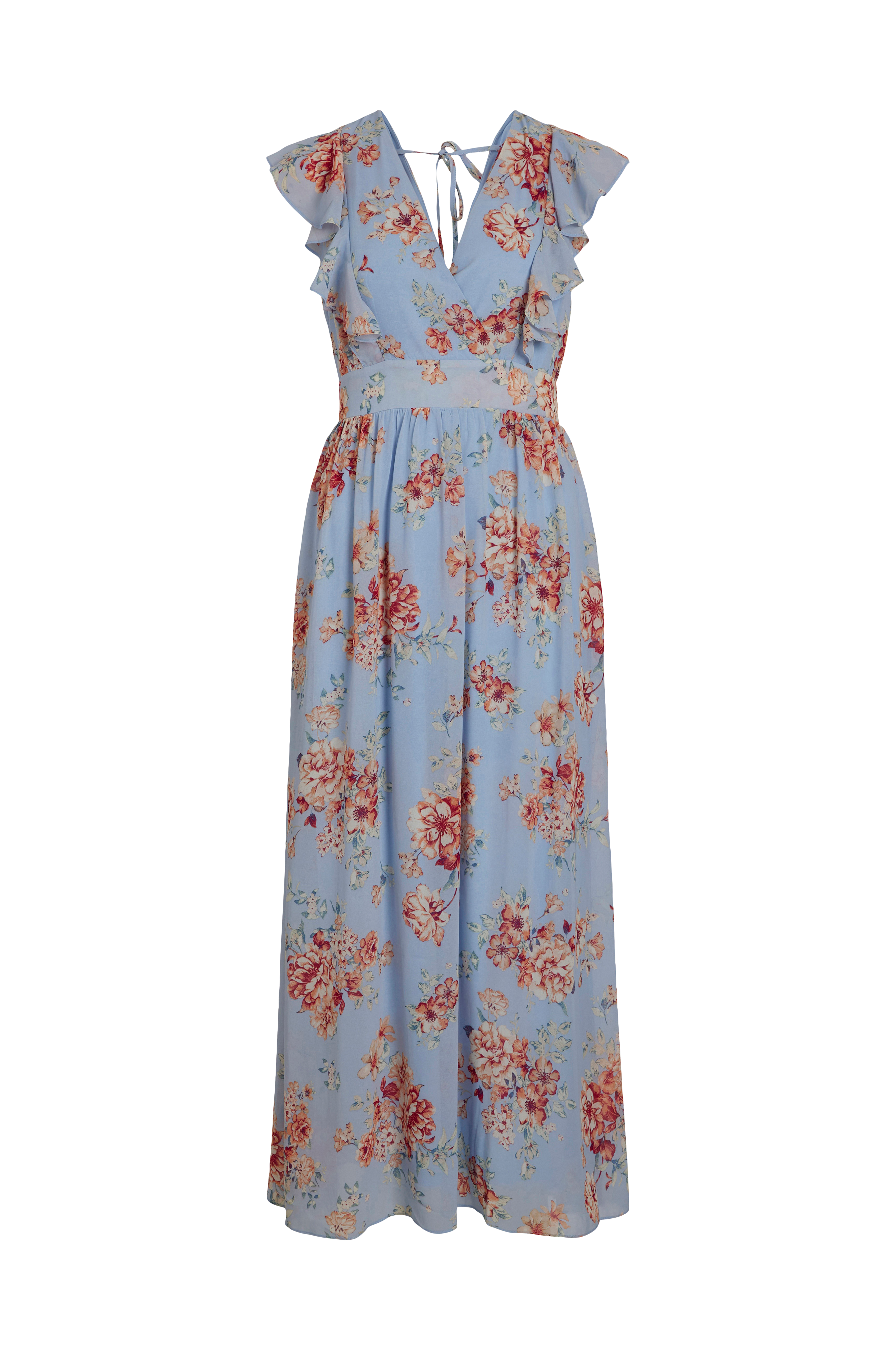 • Lang kjole i chiffon• V-udskæring med slå-om• Volanter på skuldrene• Bindebånd i nakken• Trikotfor• Skjult lynlås i ryggen• Længde: 137 cm i størrelse 36
