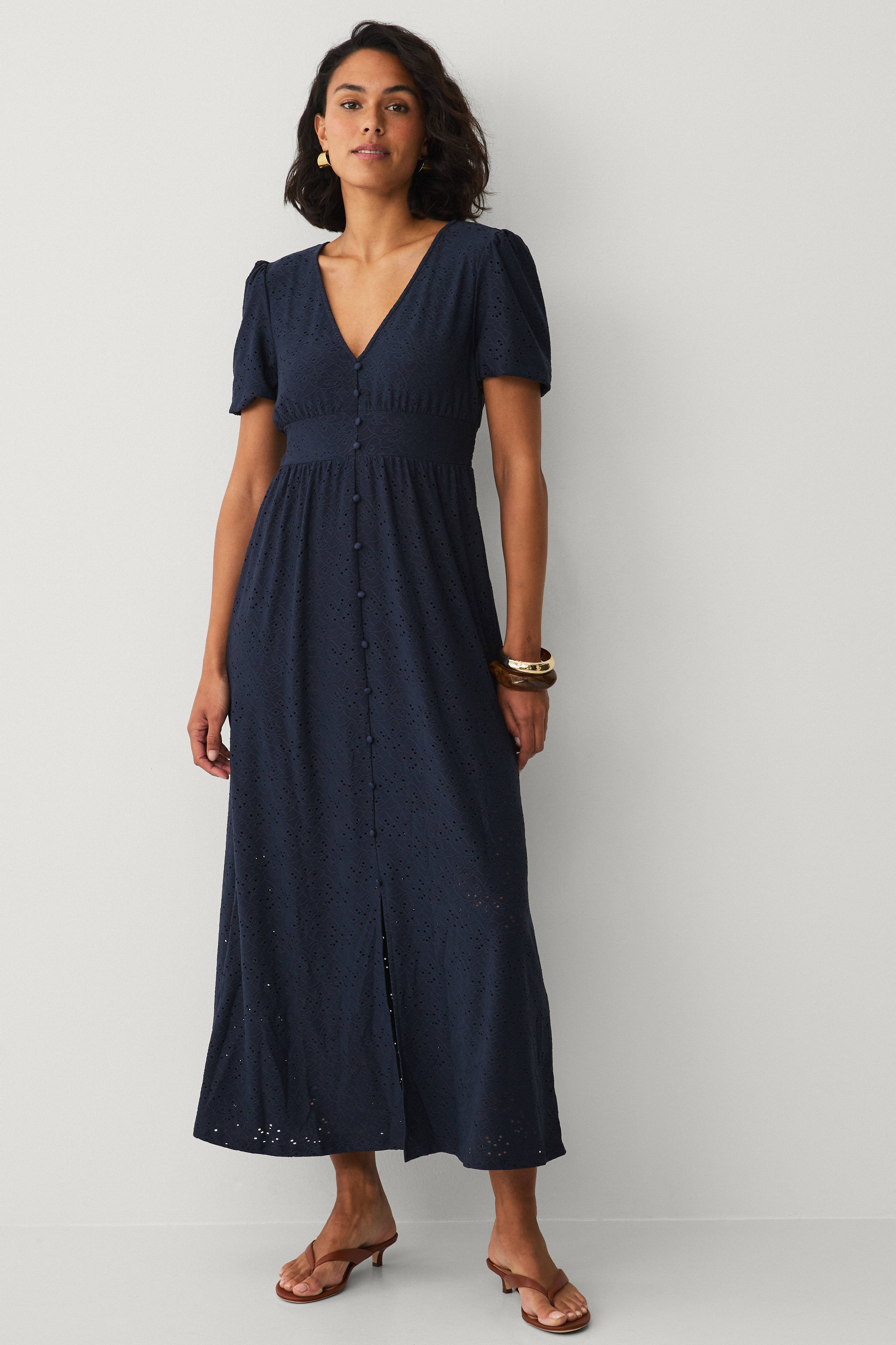 • Lang, figurformede model med hulbroderier• V-formet halsudskæring• Kort ballonærme• Beklædte dekorationsknapper hele vejen frem• Bredt indlæg ved taljen med smock bagpå• Foret• Længde: 135 cm i størrelse S