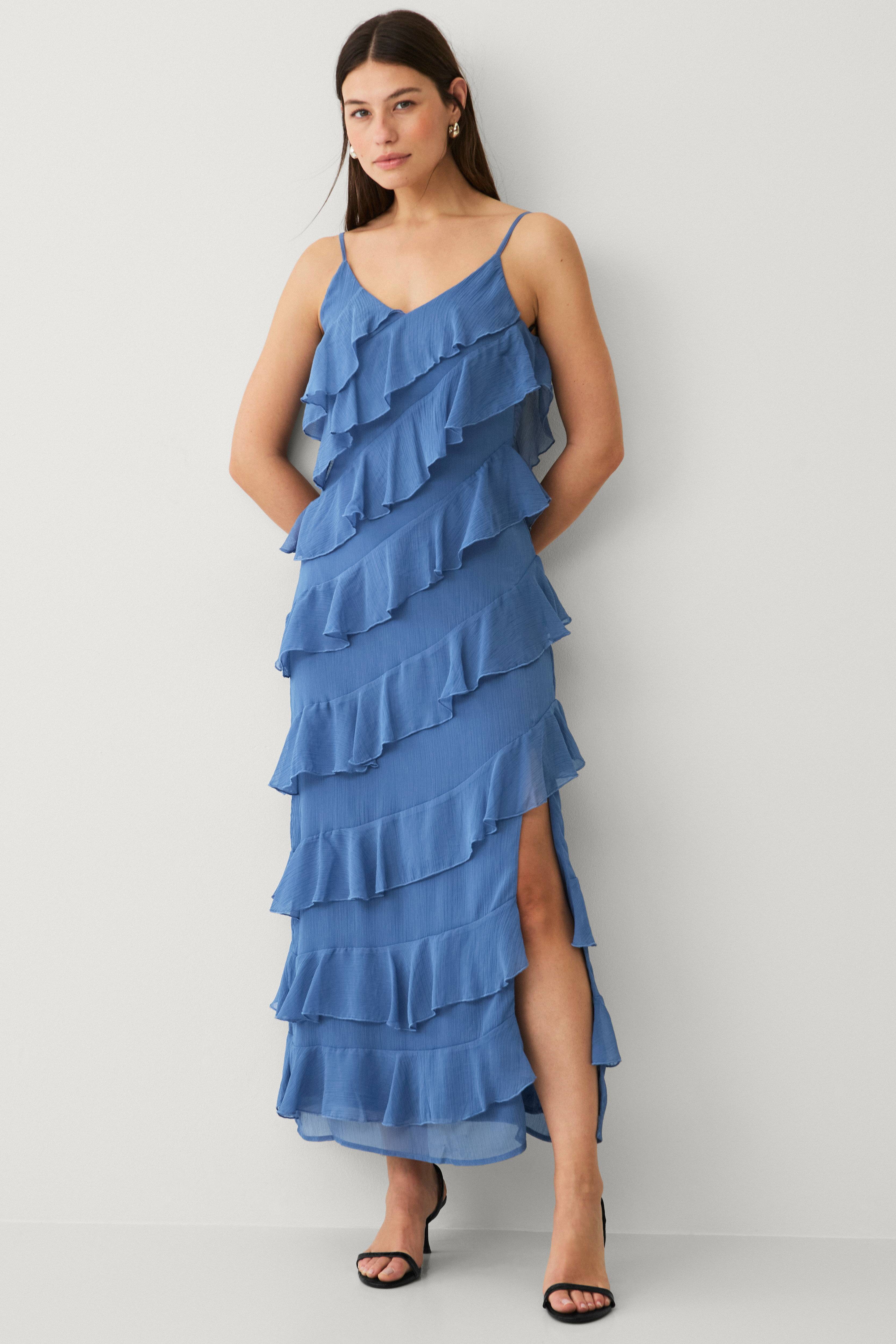 • Lang, ærmeløs model i chiffon crepe med volanter• V-udskæring i halsen og i nakken• Tynde, justérbare skulderstropper• Foret• Længde: 136 cm i størrelse 36