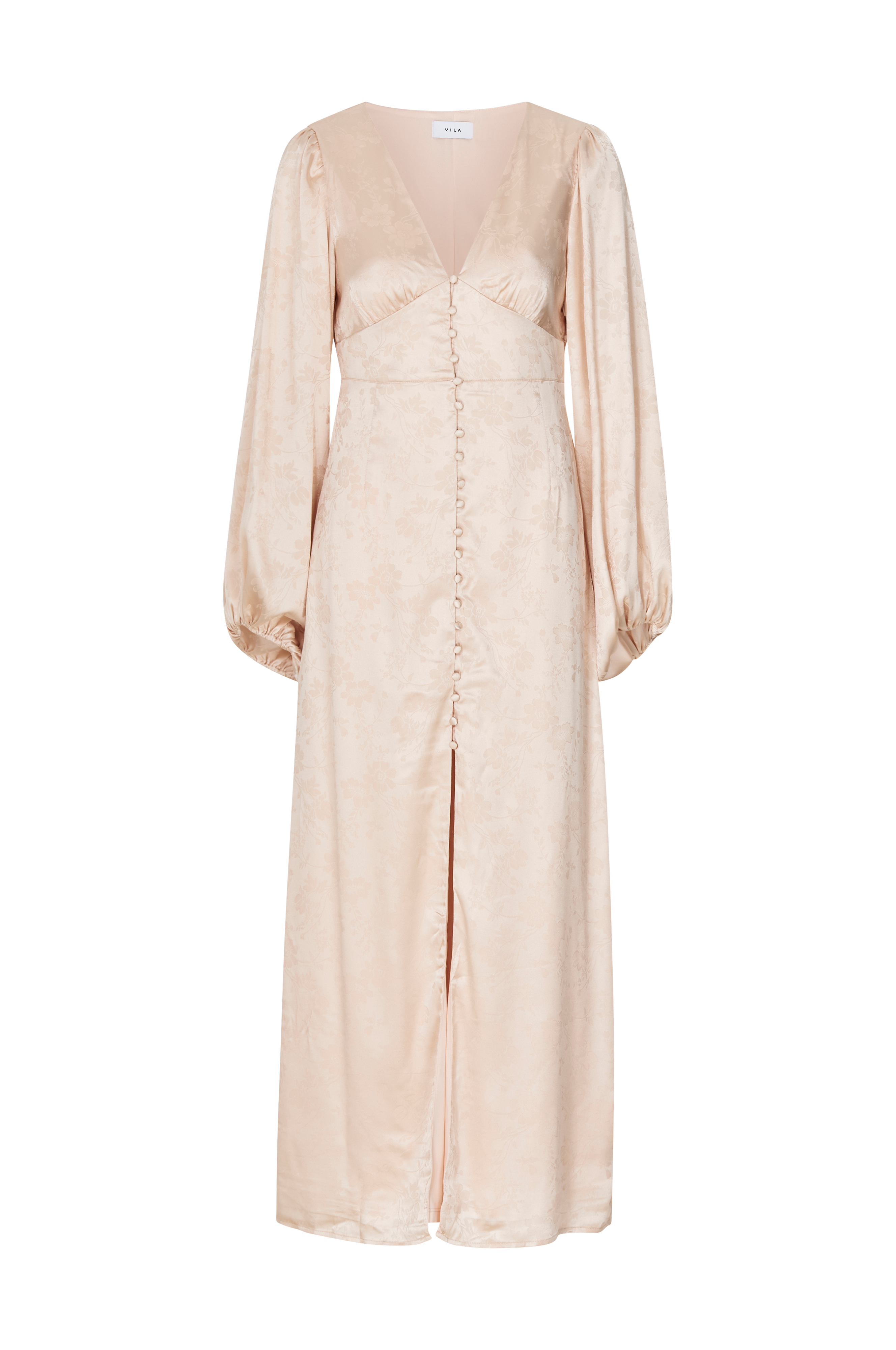• V-udskæring • Samling ved brystet • Stofbetrukkede knapper foran • Lange, voluminøse ballonærmer med elastiske manchetter • Høj slids foran • Skjult lynlås i siden • Fremstillet af skinnende satin med jacquardmønster • Længde: 140 cm i størrelse 36