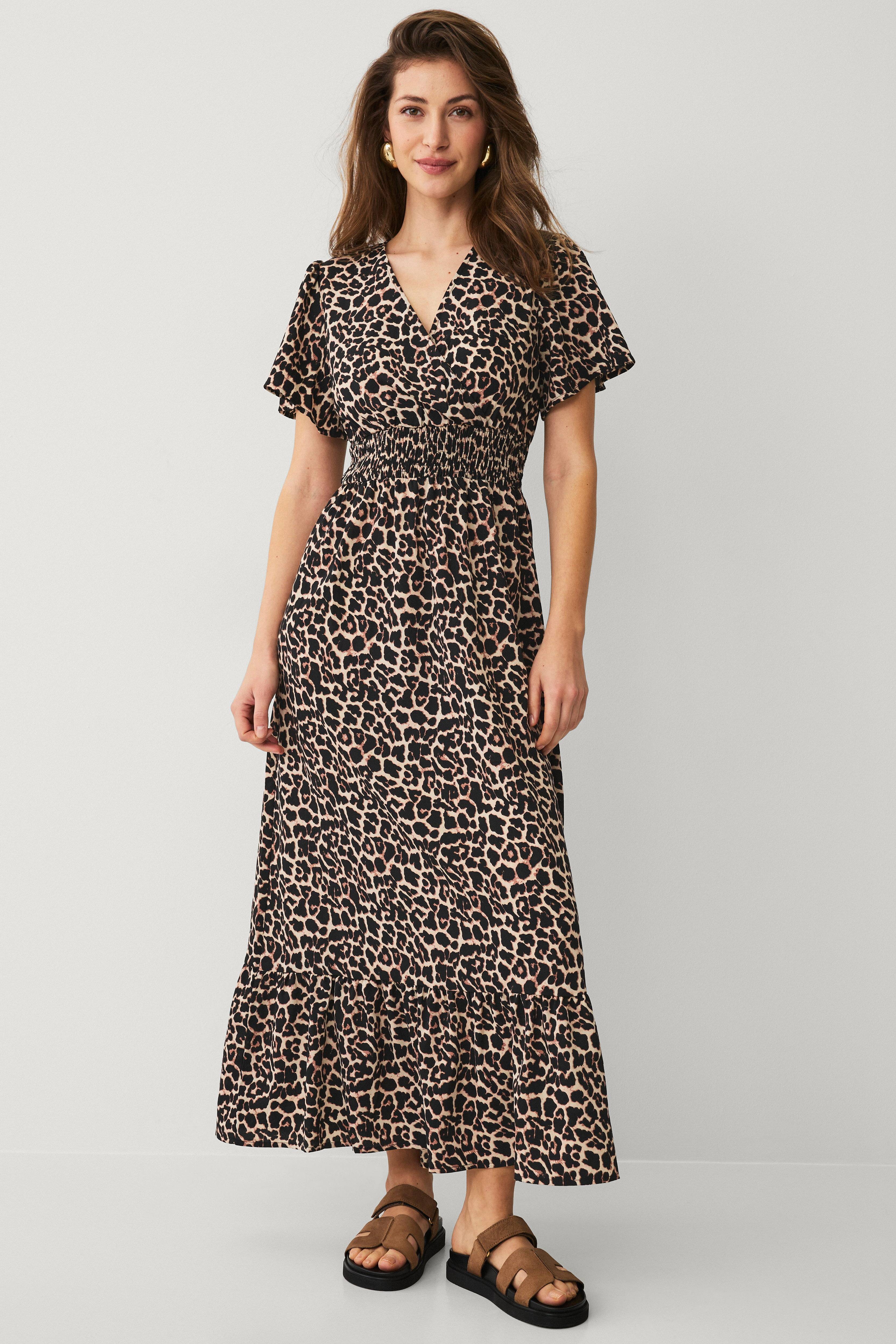 • Lang, figurformede model• Slå-om design oppe foran• Kort ballonærme• Bred smock ved taljen• Brede volanter ved nederste kant• Længde: 135 cm i størrelse 36