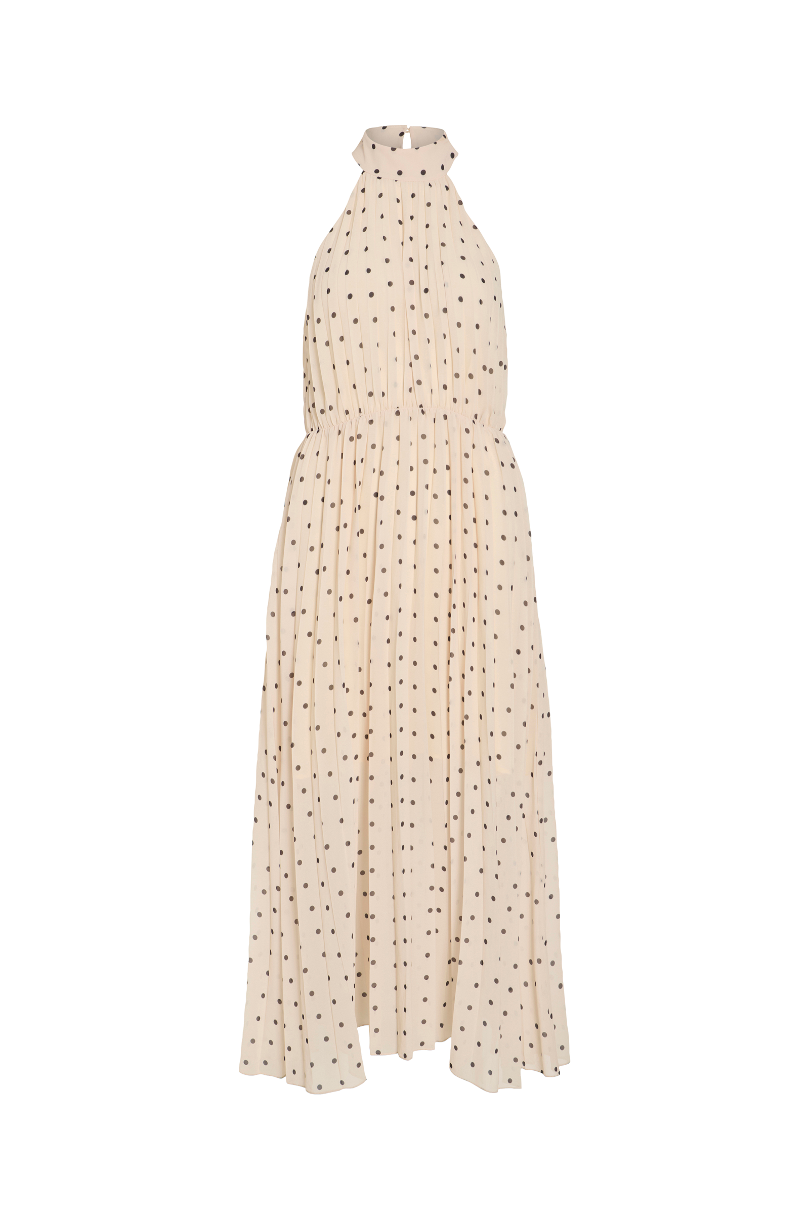 • Lang, plisseret kjole• Halterneckdesign• Nøglehulsåbning i nakken med lukning• Elastik ved taljen• Skjult lynlås i den ene side• Tekstilforing• Længde: 137 cm i størrelse 36