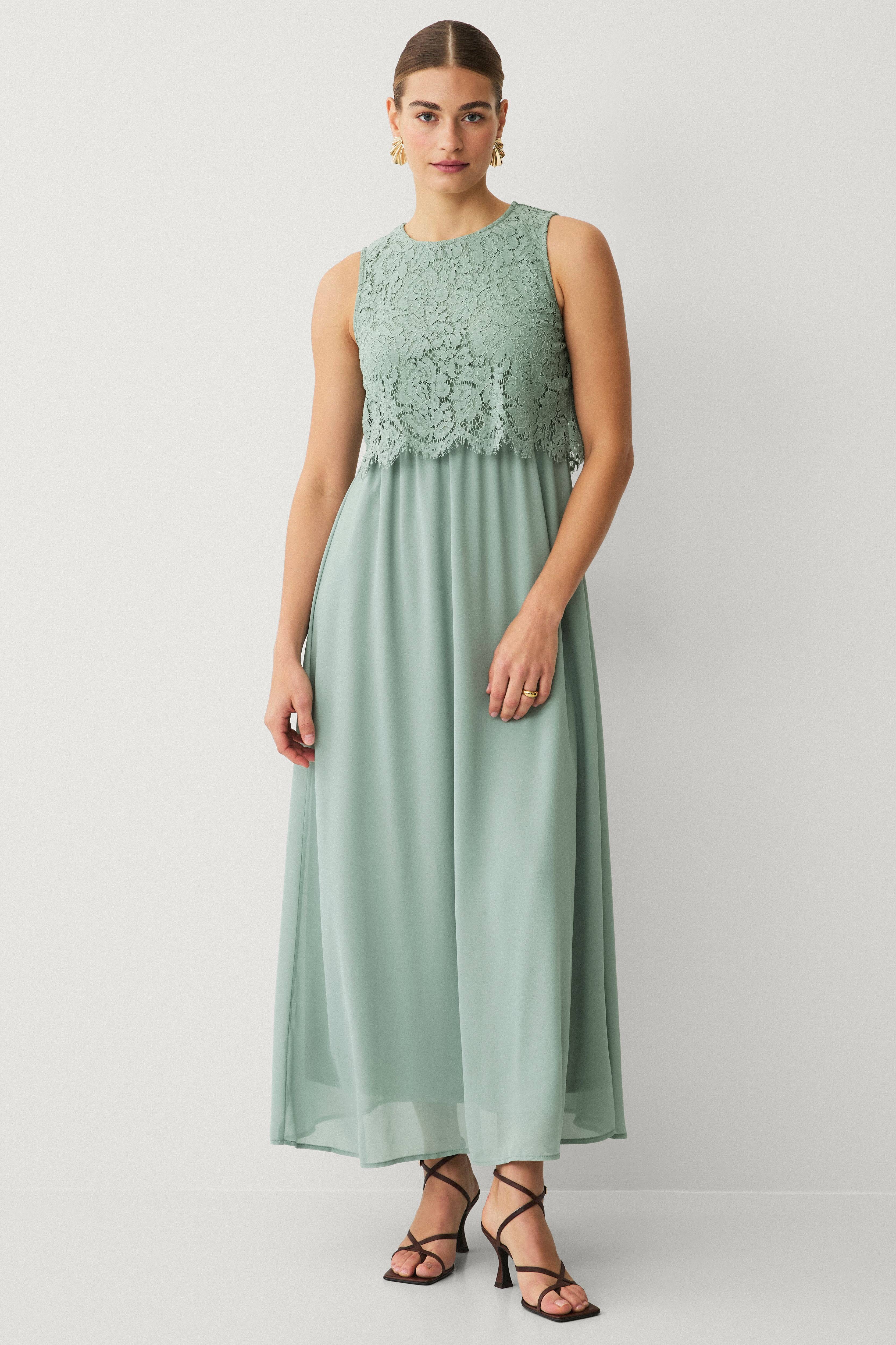 • Ærmeløs model med svaj• Rund hals med knap i nakken• Løstsiddende øvre del i blonde• Defineret, elastisk talje• Foret• Længde: 145 cm i størrelse 36