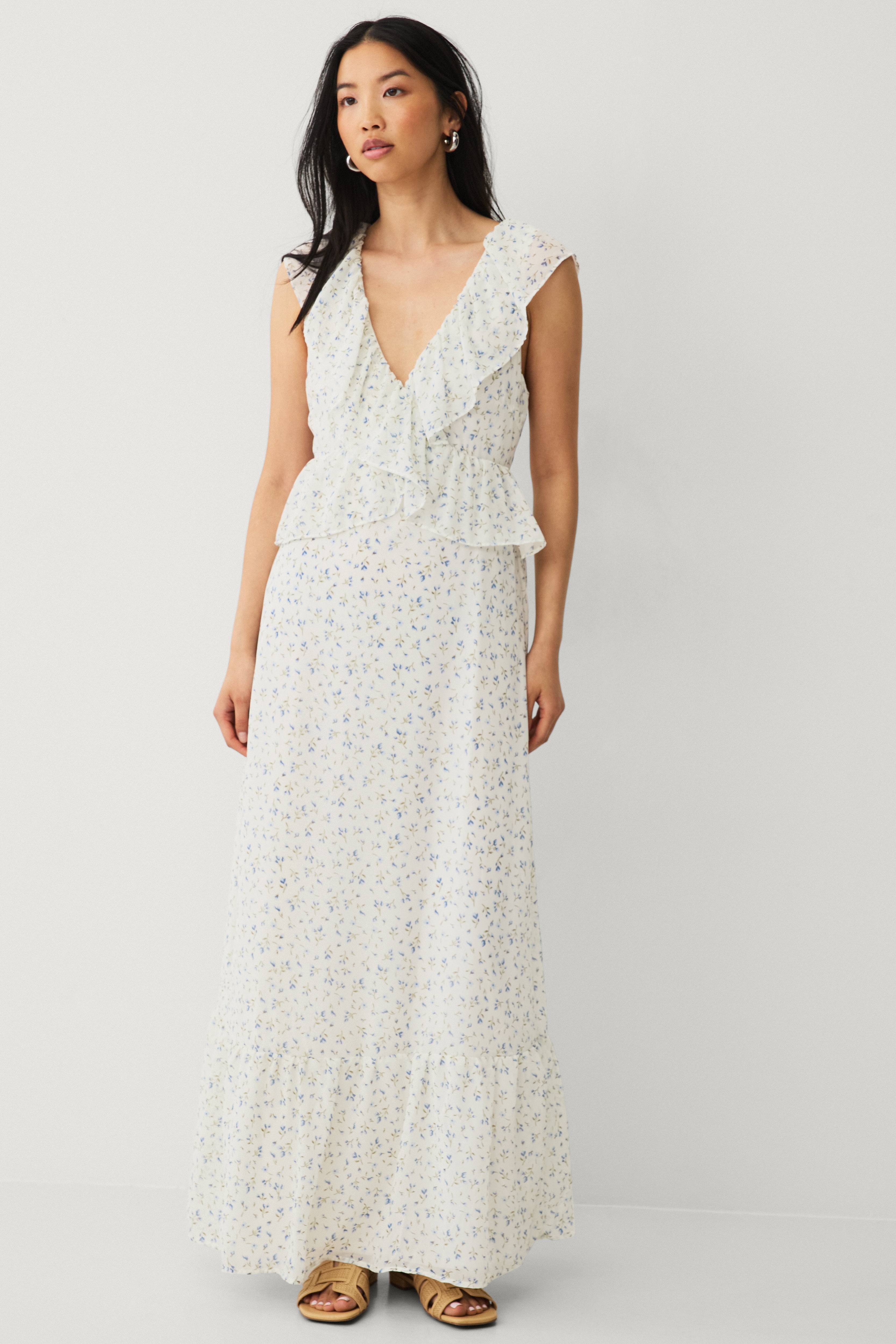 • Lang model med svaj i chiffon• Dyb v-udskæring med flæsekant og bindebånd oppe bagved• Åben ryg med indlagt elastik øverst på nederdelen• Volant foran på taljen og nederst på kjolen• Foret• Længde: 142 cm i størrelse 36