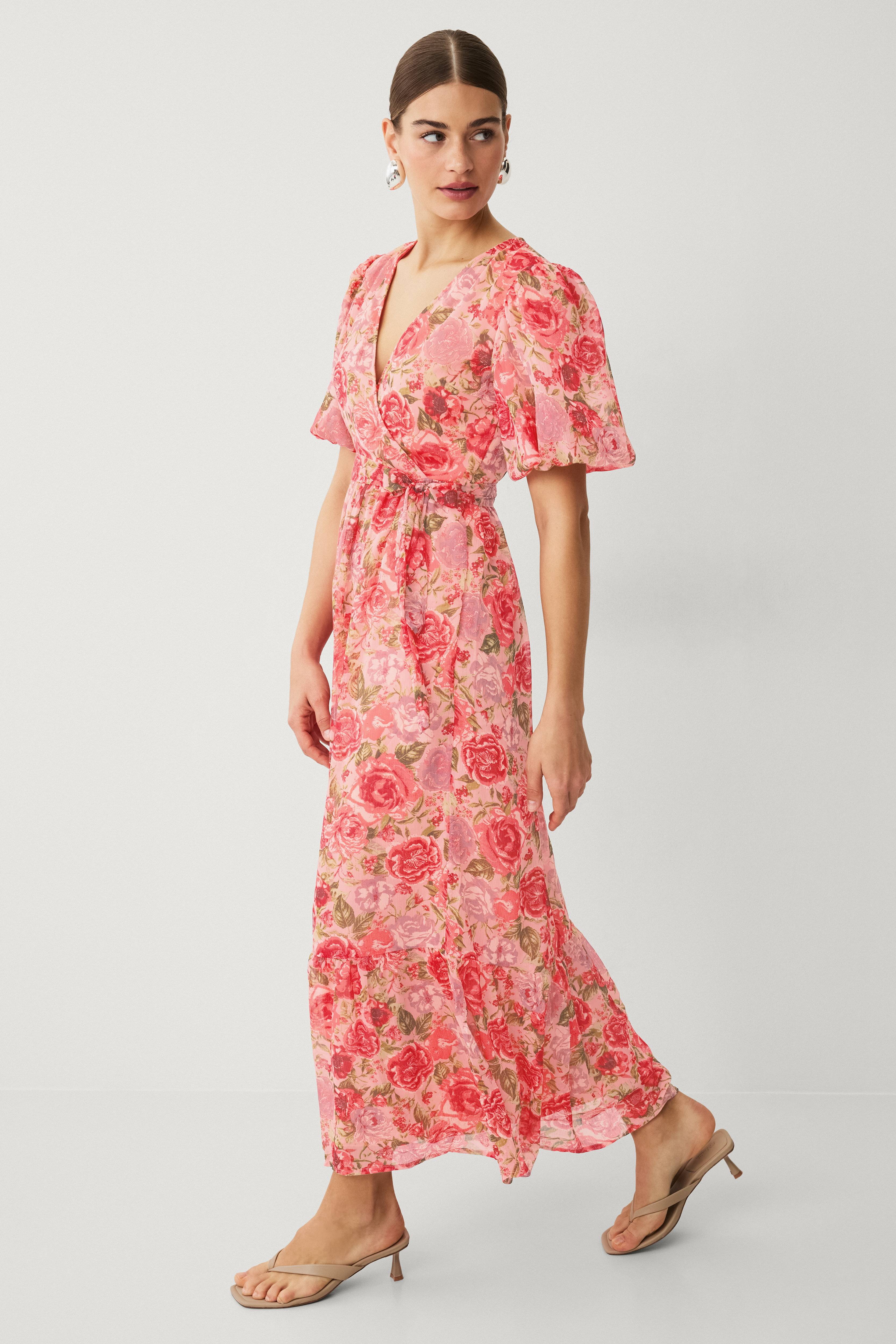 • Lang, figurformede model i chiffon crepe• Slå-om design på toppen• Kort ballonærme• Rynket talje med bindebælte• Volant ved nederste kant• Foret• Længde: 140 cm i størrelse 36