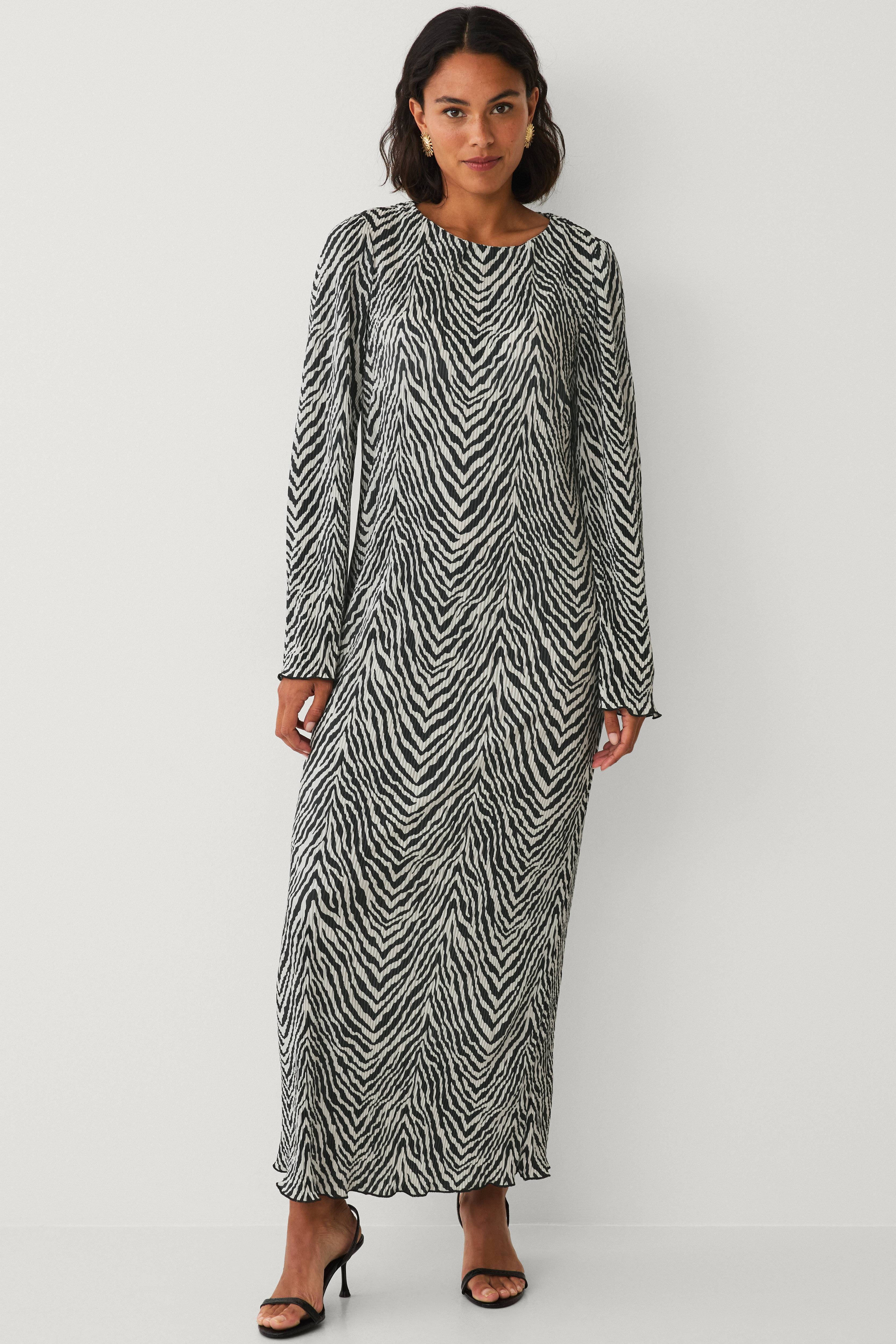 • Lang, zebramønstret kjole i plisseret materiale• Bred, rund halsudskæring• Lange pufærmer med bølgede ærmeafslutninger med svaj• Bølget søm• Længde: 145 cm i størrelse S