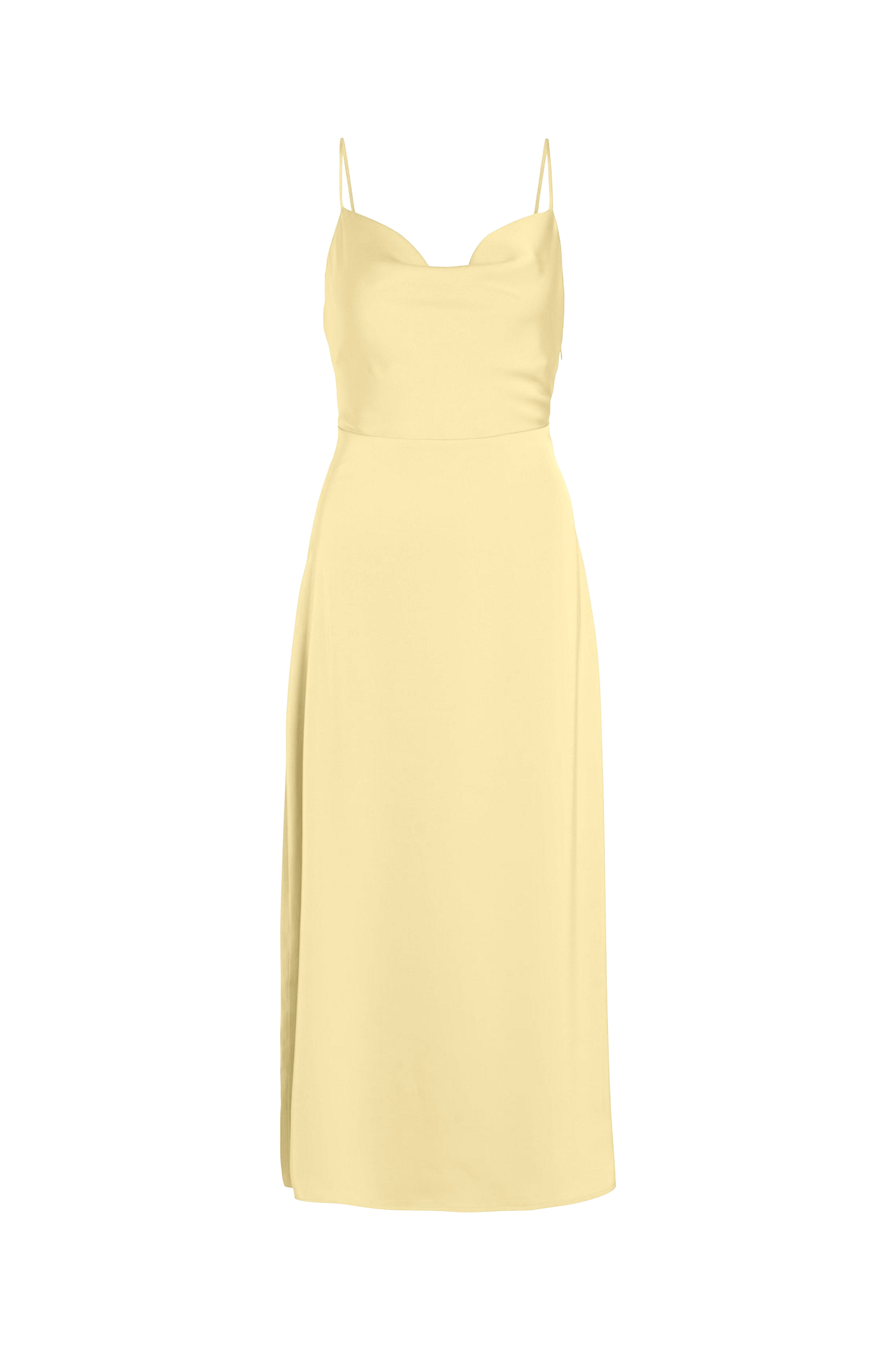 • Fuld længde, elegant kjole i satin• Tynde, justérbare skulderstropper• Dyb ryg• Skjult lynlås i siden• Længde: 134 cm i størrelse 36