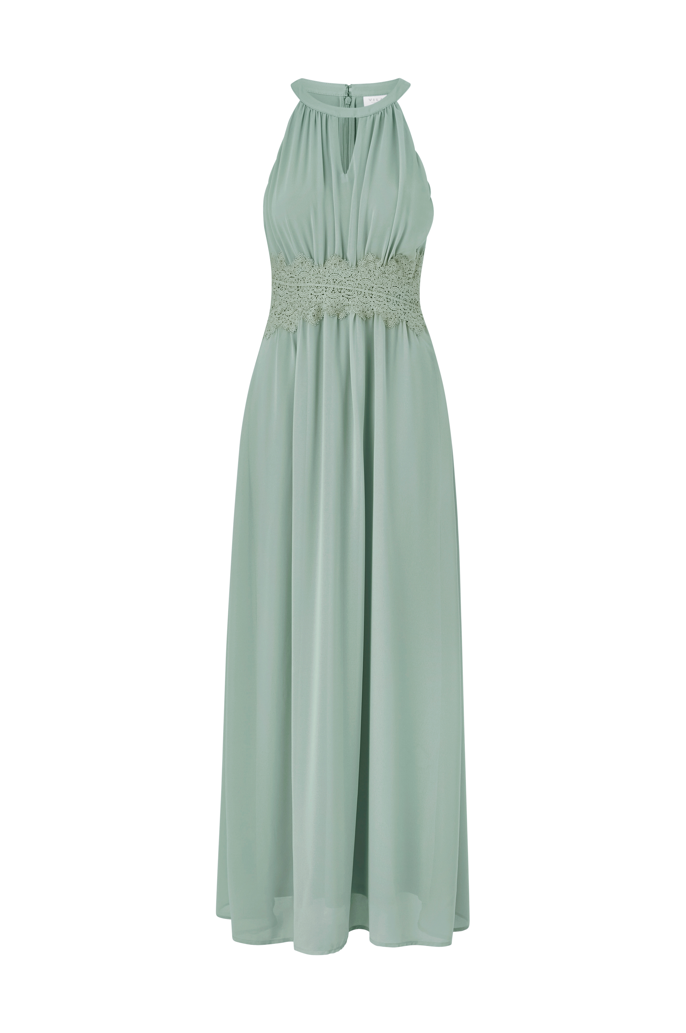 Maxikjole viMilina Halterneck Maxi Dress fra Vila. Elegant, figursyet, ærmeløs model med halterneck som har lille slids foran i halsen. Afskæring i taljen med bred, påsyet blonde foran og vidde i nederdelen. Vævet chiffon med for af jersey. Længde ca. 154 cm i str. 36.