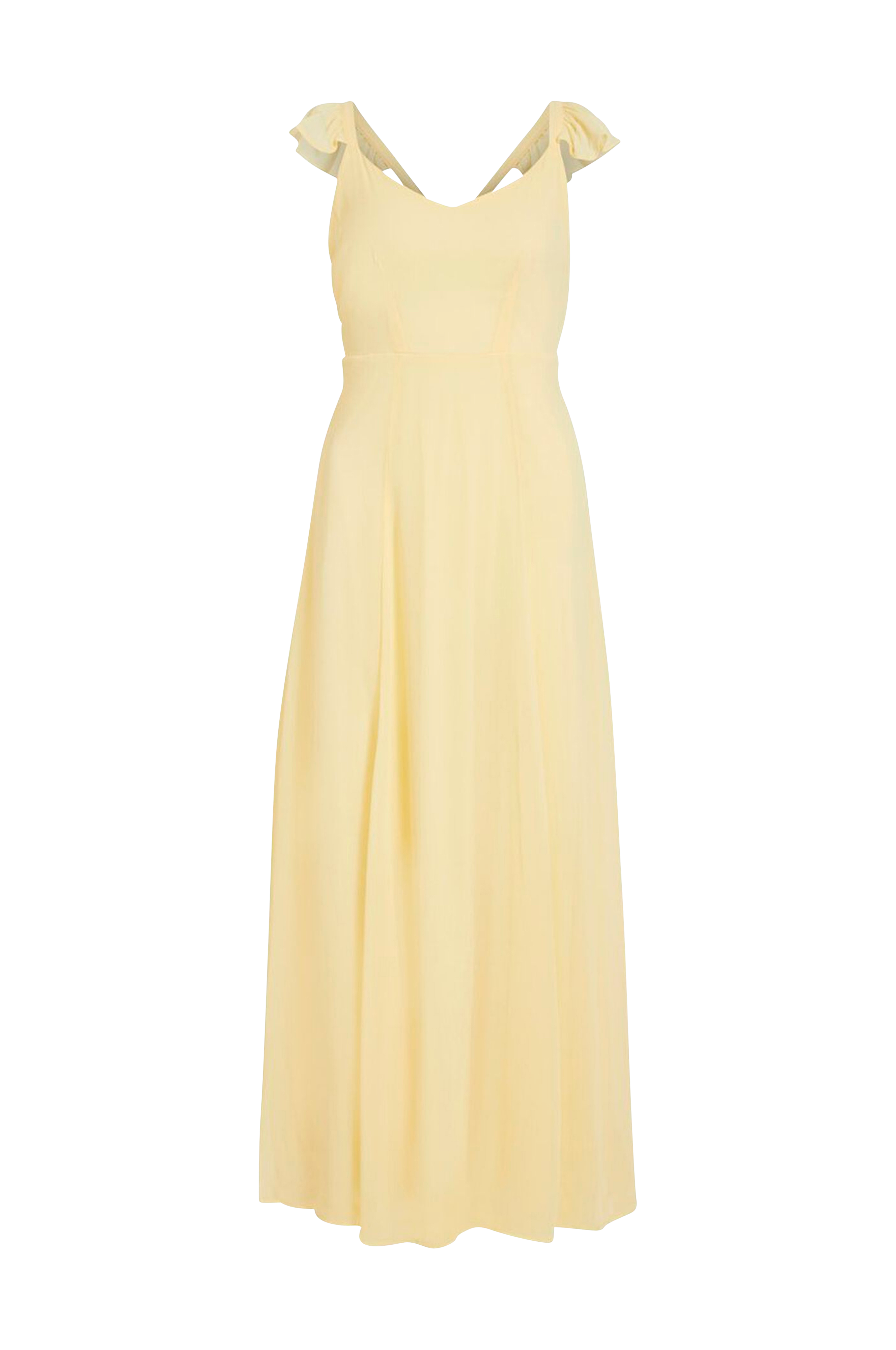 Maxikjole viRilla Open Back Maxi Dress fra Vila, bølgende, hellang kjole i crepet chiffon. Krydsede skulderstropper med flæser som justeres bagpå. Skjult lynlås i ryggen. I jersey. Længde ca. 155 cm i str. 36.