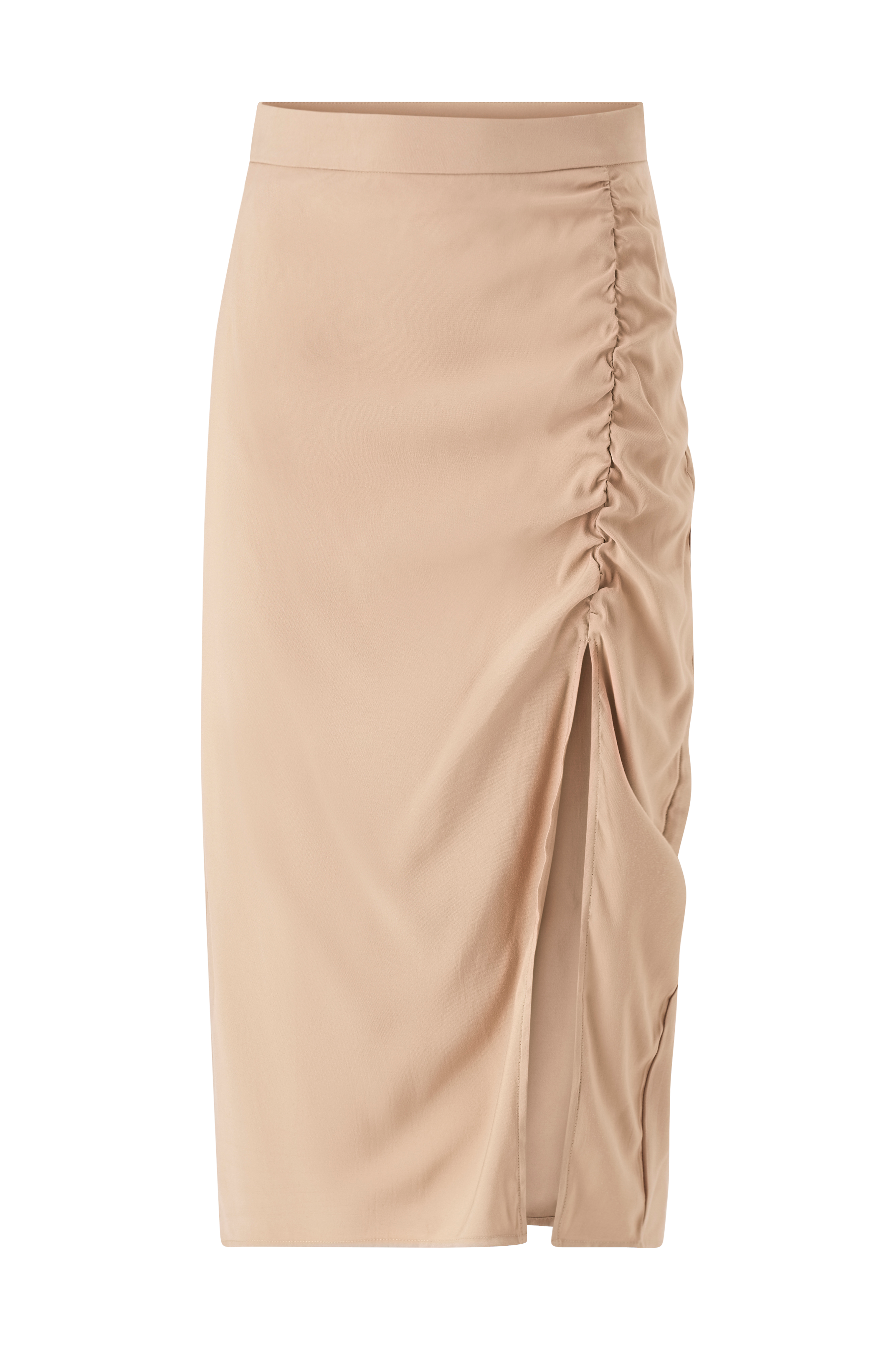 • Figurformede model• Drapering i siden med høj slids• Linning med skjult lynlås i siden• Længde: 82 cm i størrelse 36