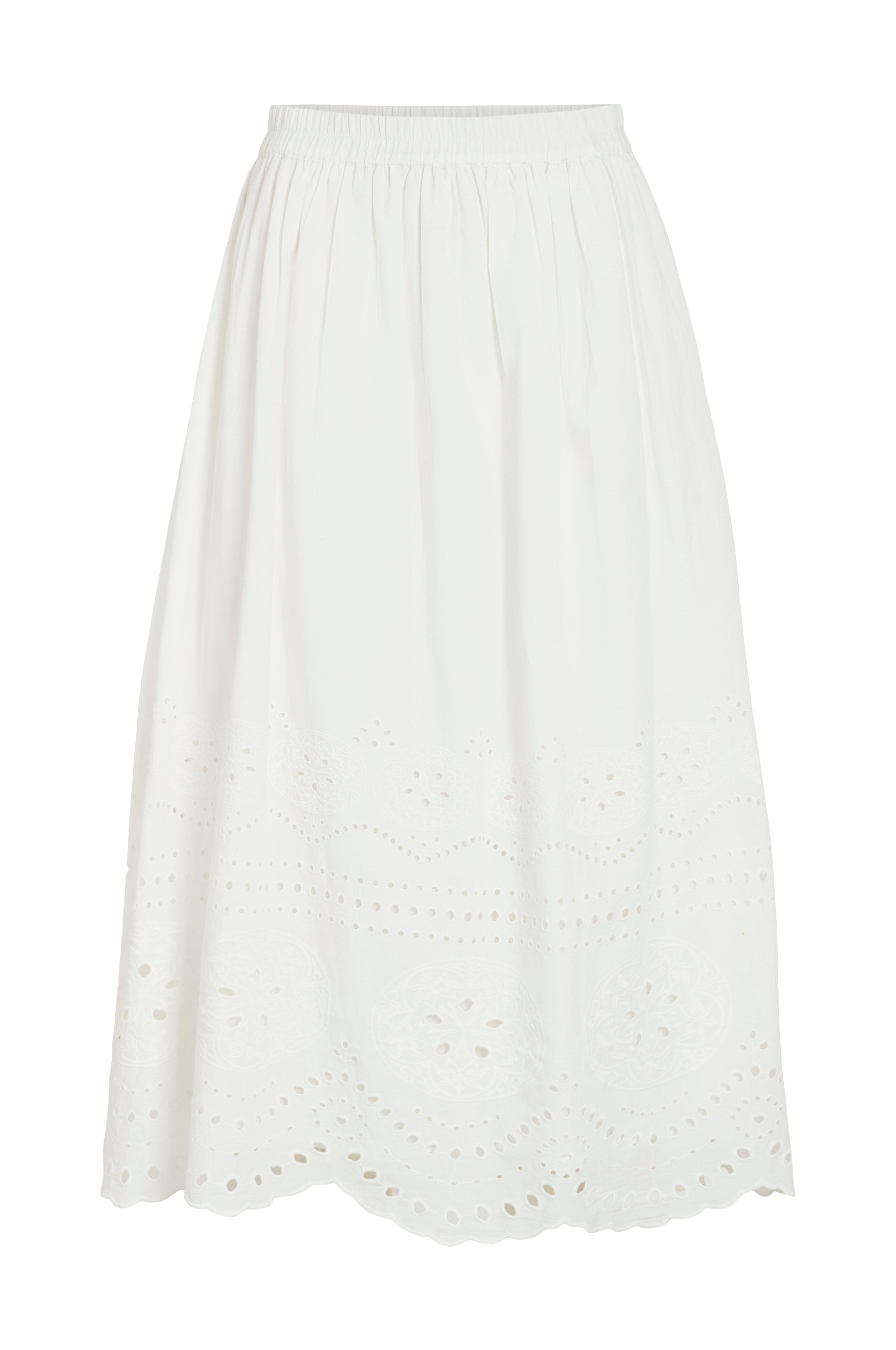• Model med svaj med hulbroderier nederst• Linning med indlagt elastik• Bølget søm• Foret• Længde: 85 cm i størrelse 36