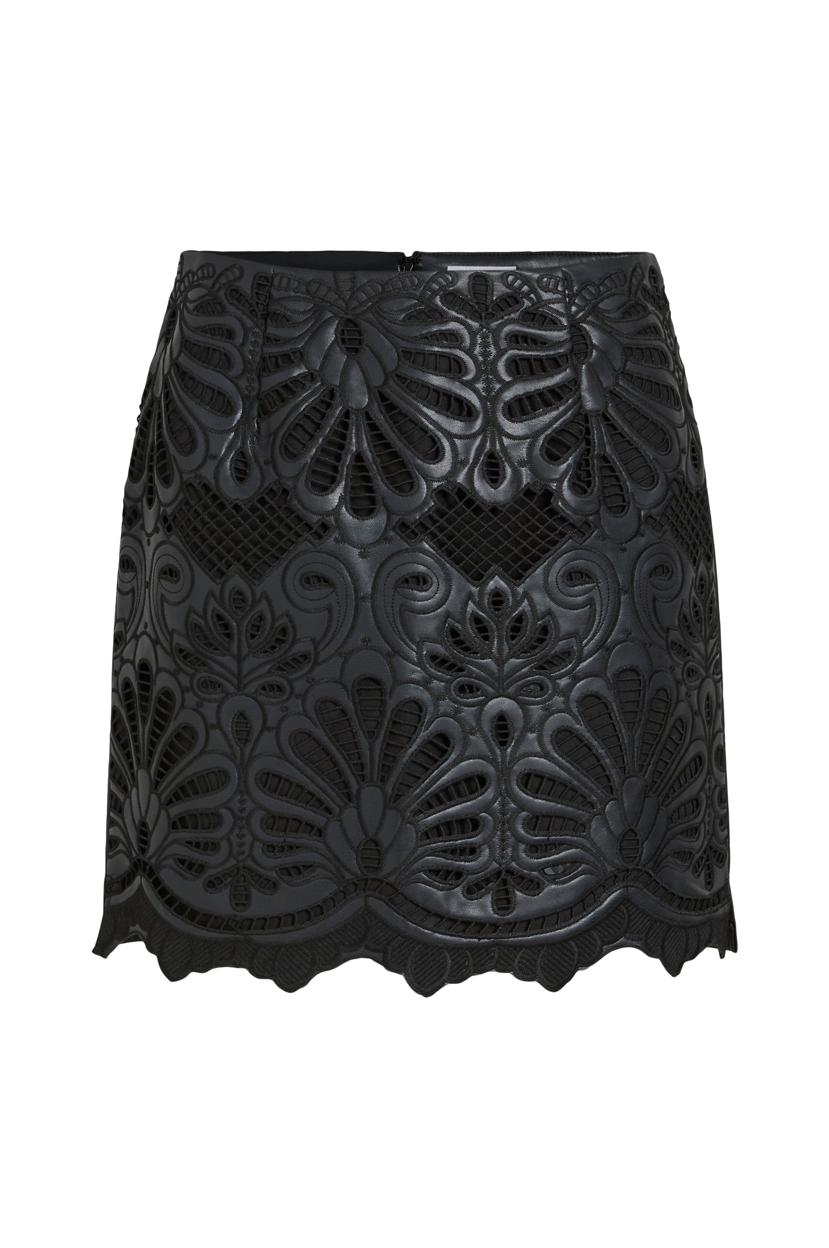 • Kort nederdel med broderet frontsektion og stoffor• Bagside i imiteret læder• Kort slids i siderne• Indsnit foran på taljen og bagpå ved taljen• Lynlås oppe bagved• Længde: 45 cm i størrelse 36