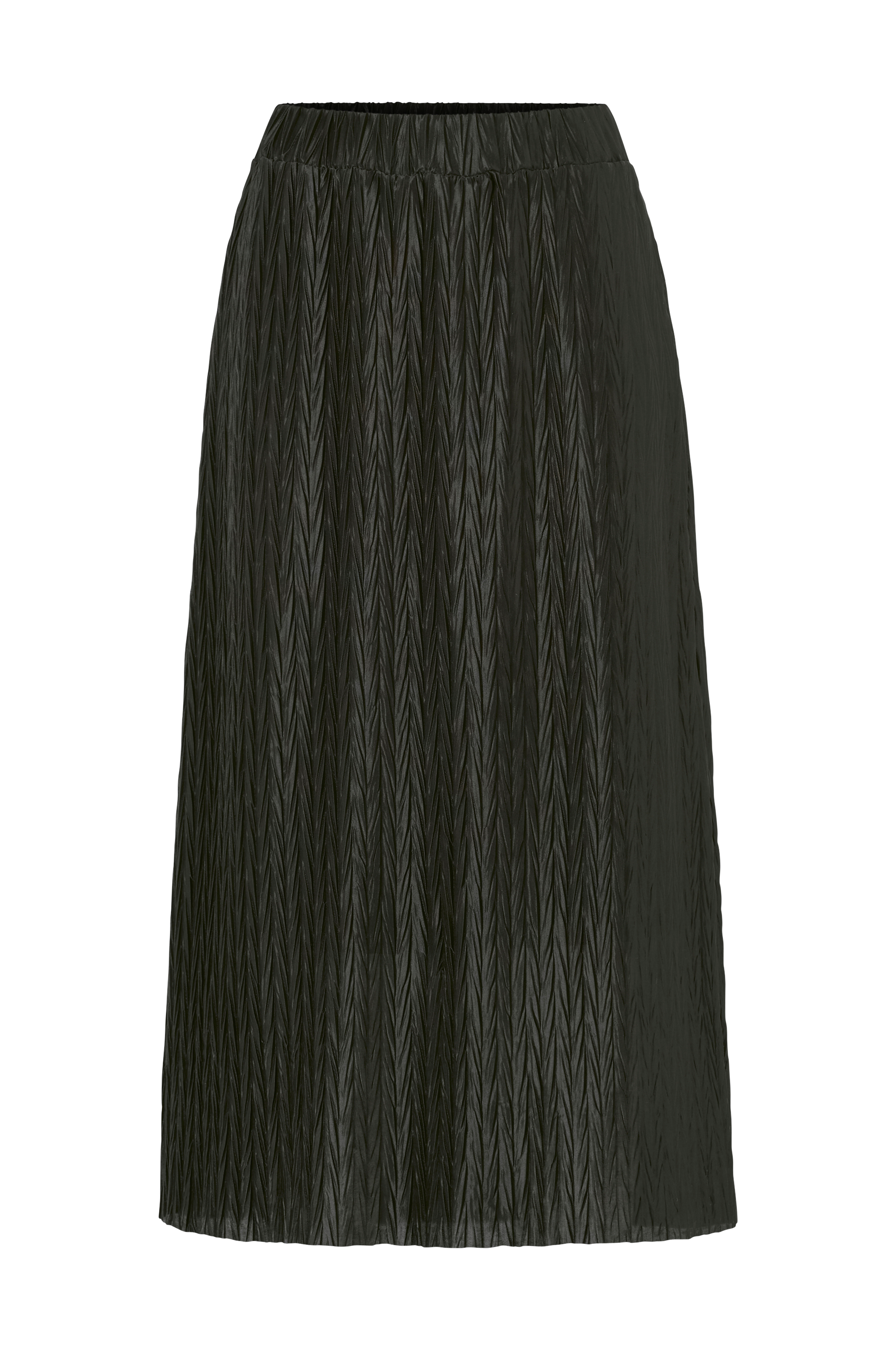 Læglang nederdel i blank, strukturmønstret jersey med usømmet kant forneden og elastisk talje. Foret. Længde ca. 83 cm i str. S.