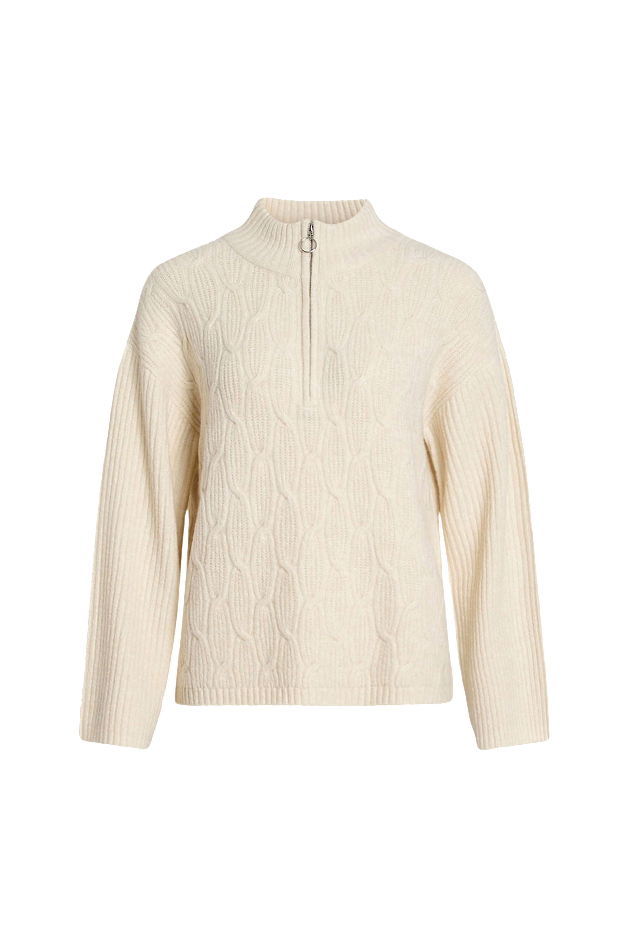 • Blød, mønsterstrikket Pullover• Høj krave med lynlås• Nedsænkede skuldre• Lange ærmer med svaj• Ribstrik bagpå