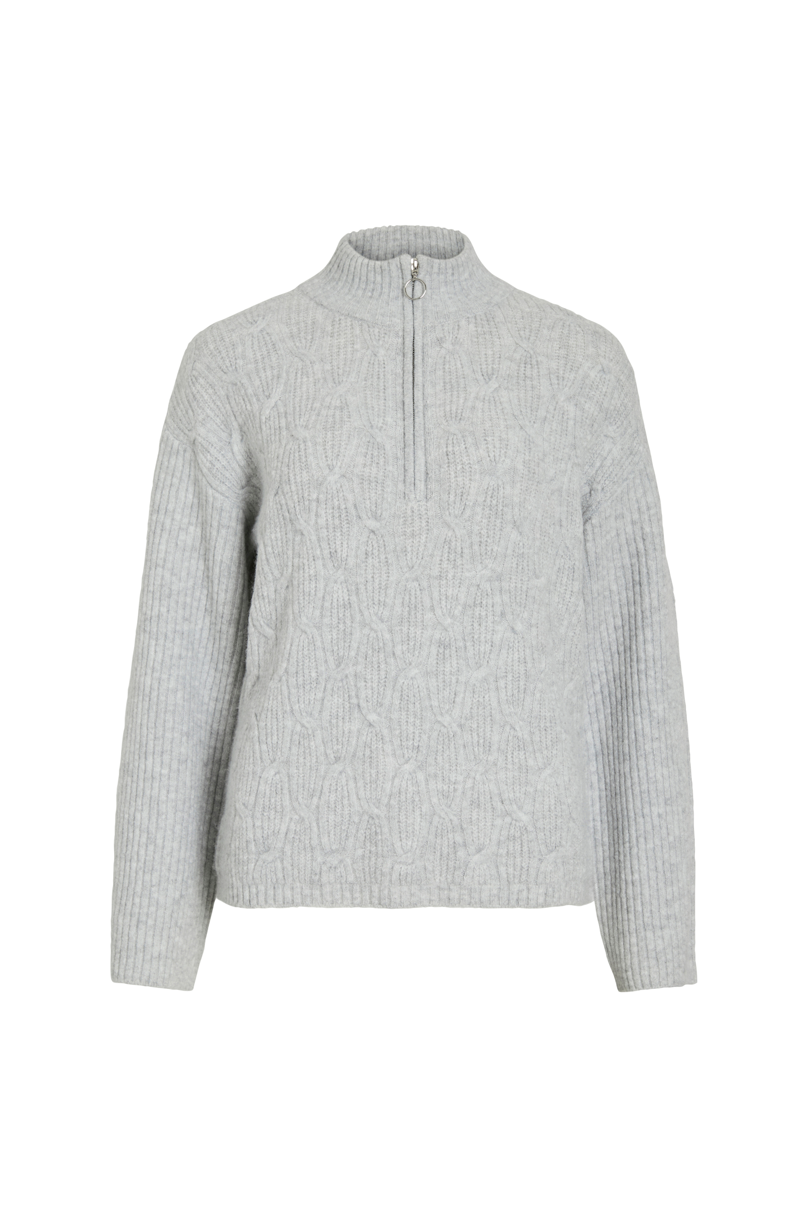 • Blød, mønsterstrikket Pullover• Høj krave med lynlås• Nedsænkede skuldre• Lange ærmer med svaj• Ribstrik bagpå