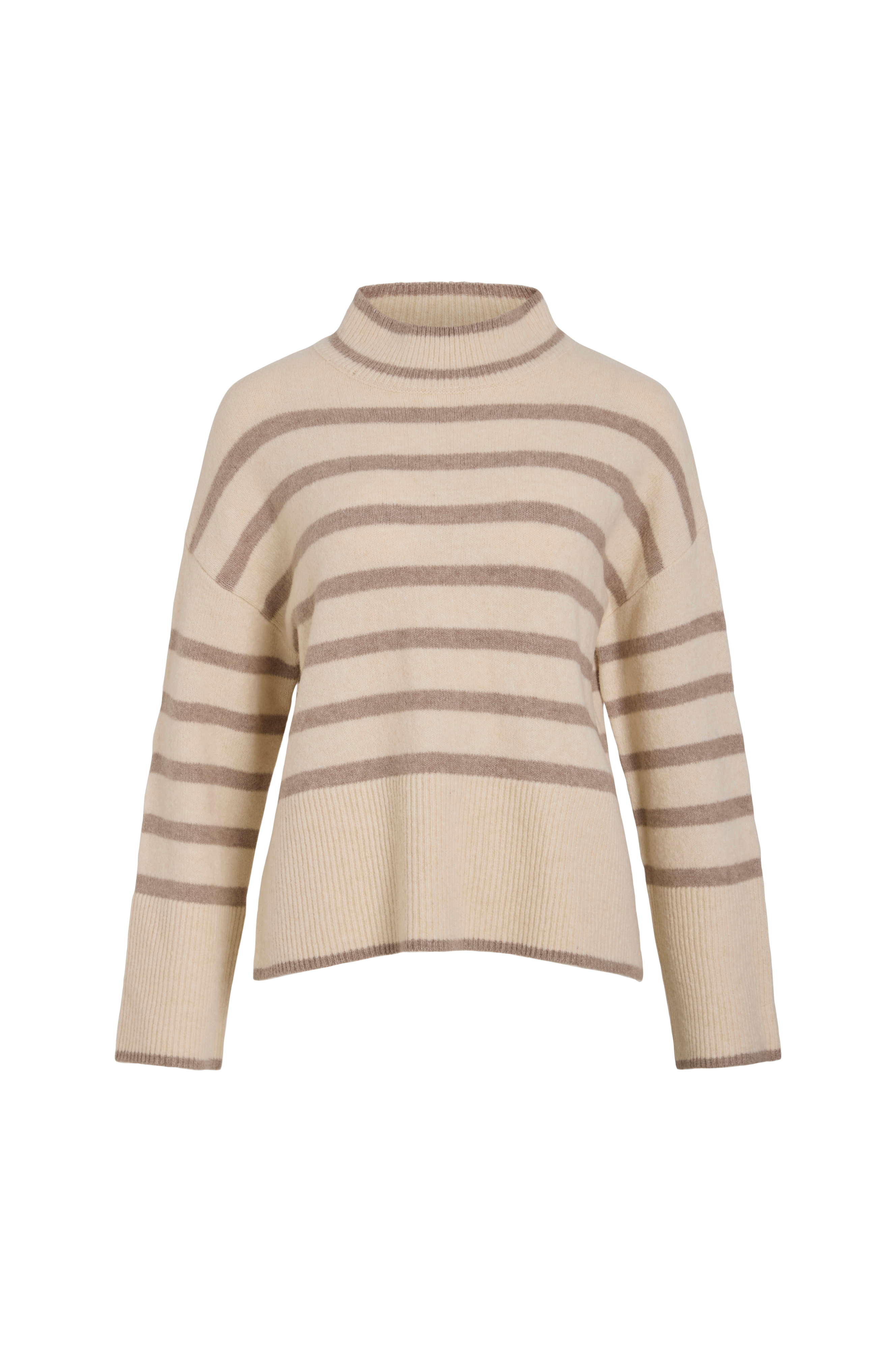 • Stribet, strikket Pullover• Høj, ribbet halsudskæring• Bred ribstrik ved manchetterne og ved nederste kant• Nedsænkede skuldre
