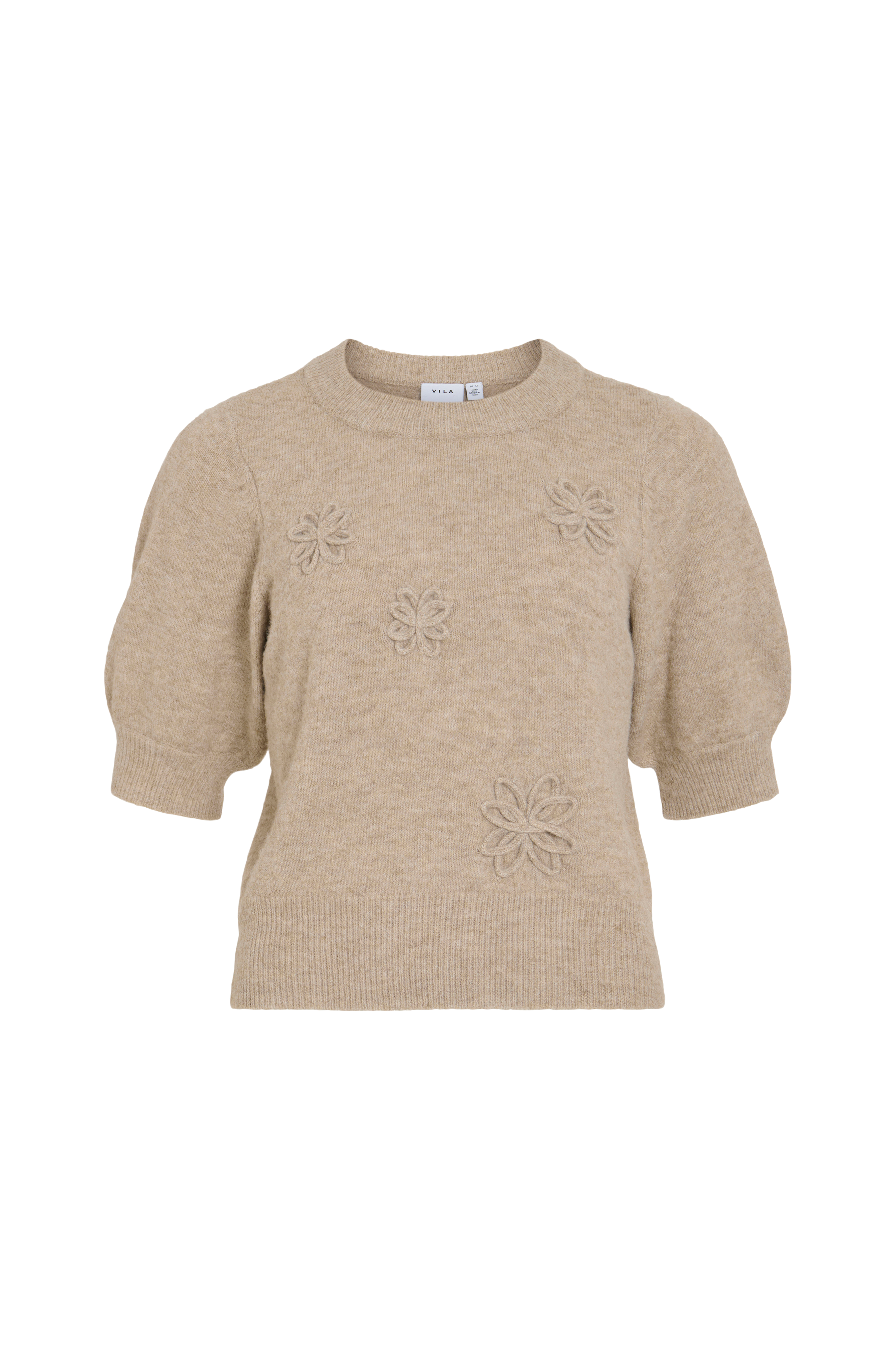 • Kortærmet, fintstrikket Pullover med påsyede blomster foran• Rund, ribbet halsudskæring• Ribmanchetter ved manchetterne og ved nederste kant