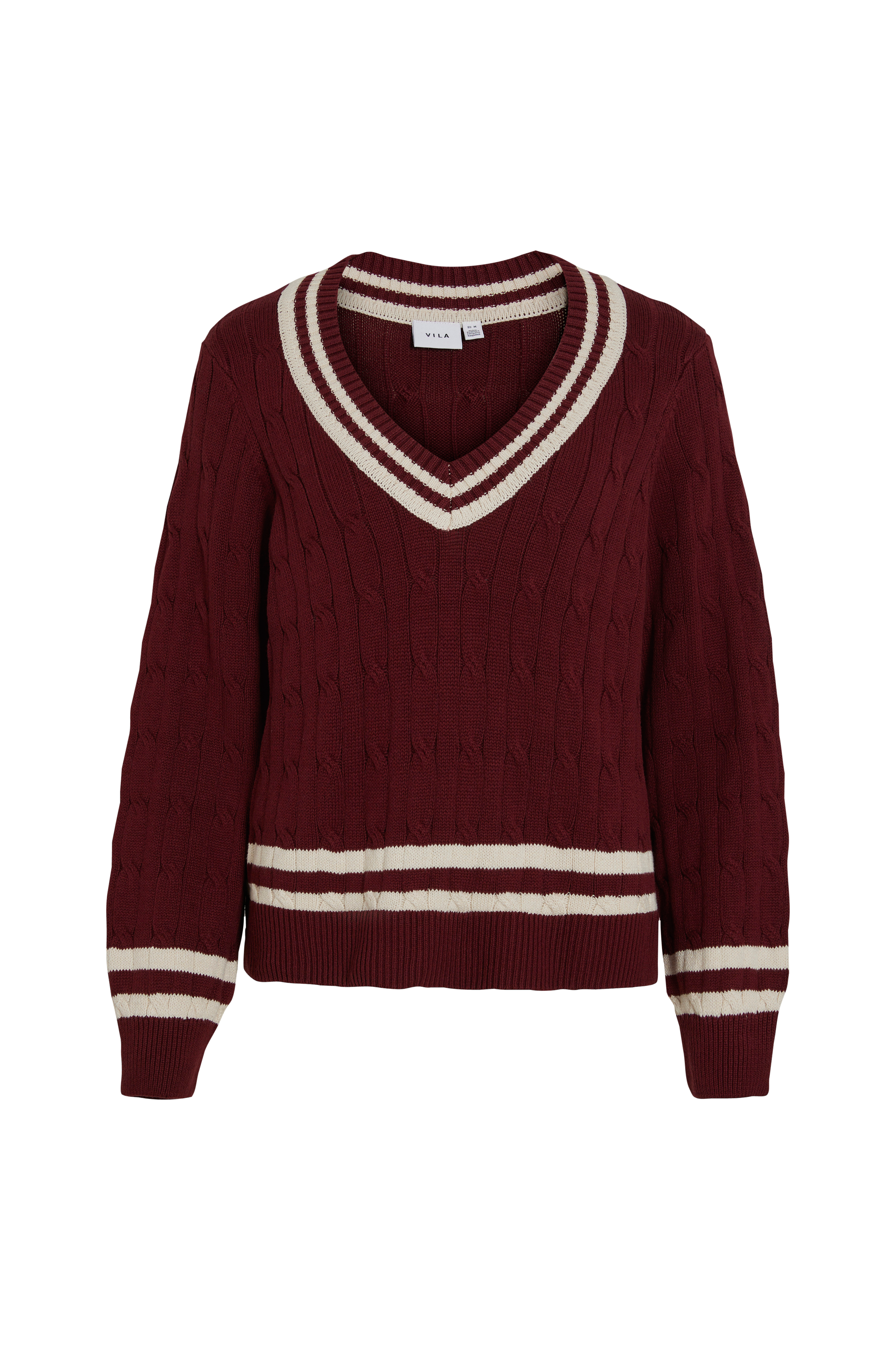 • Kabelstrikket Pullover med v-formet halsudskæring• Lang arm• Ribstrik ved manchetterne, nederst og i halsen