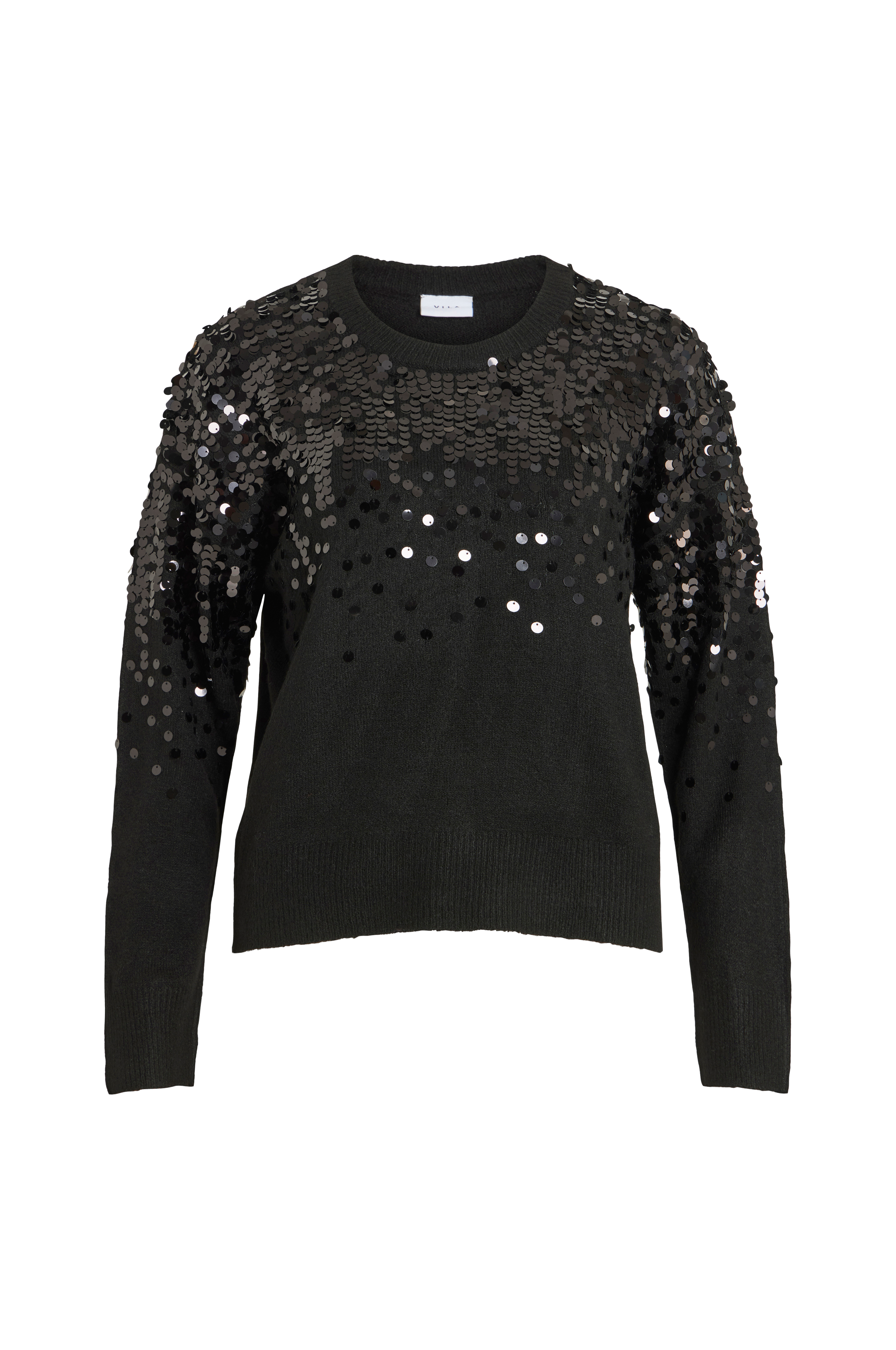 • Fintstrikket, blød Pullover med pailleter oppe foran• Rund, ribbet halsudskæring• Lange ærmer med nedsænkede skuldre• Ribstrik ved manchetterne og ved nederste kant