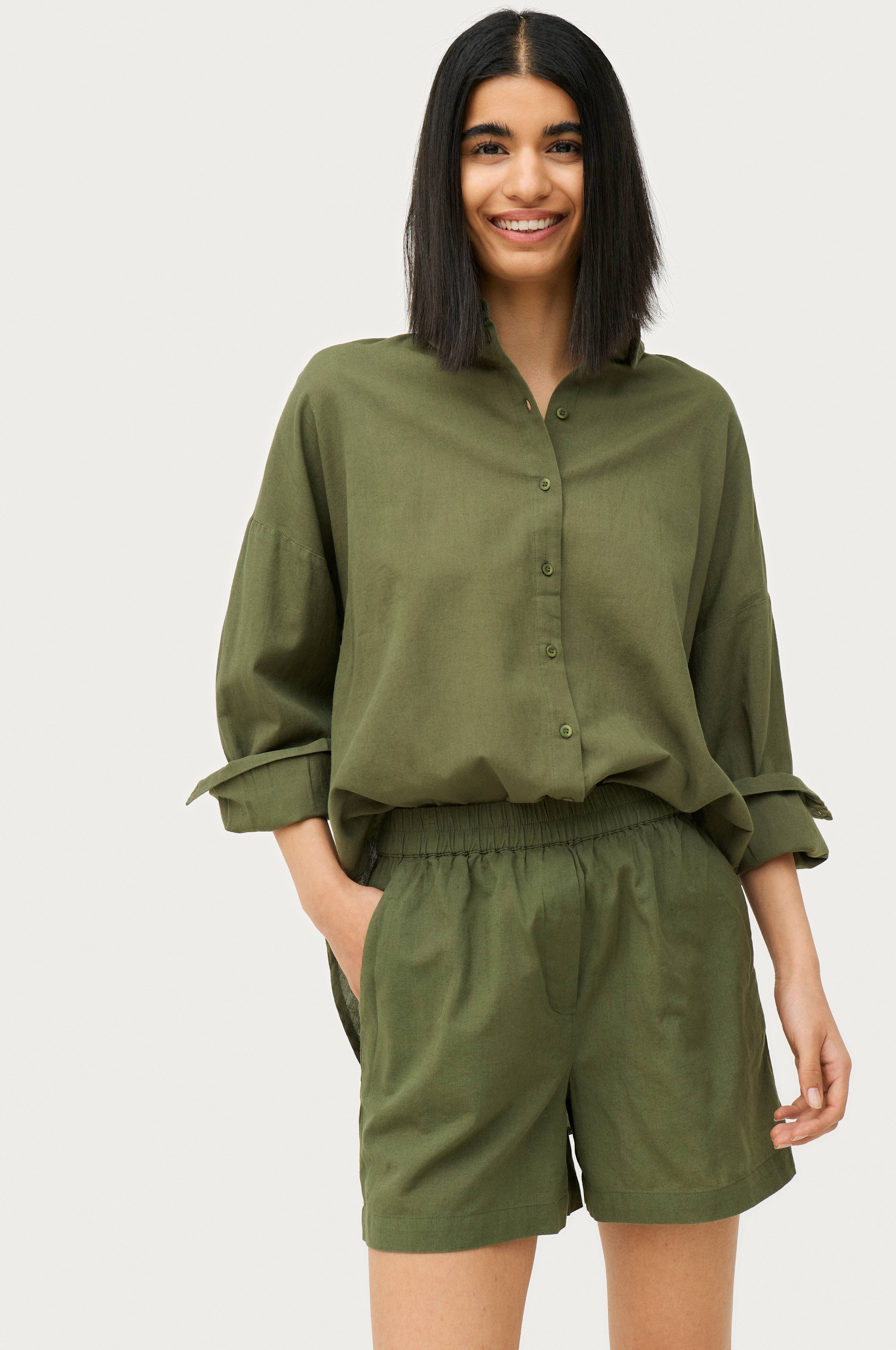 • Elastisk talje• Lommer i siderne• Fremstillet af hørblanding