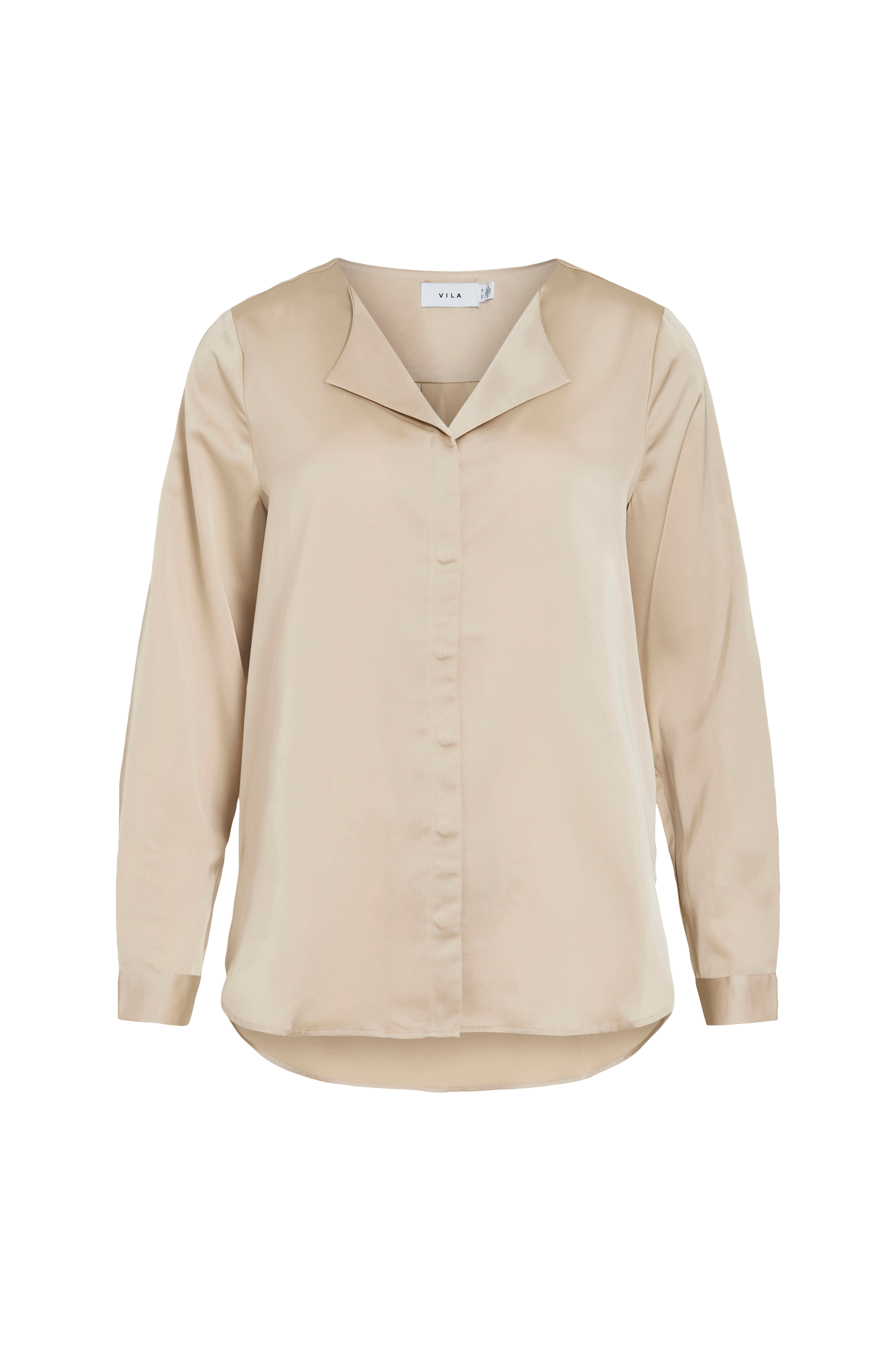 • Skjorte i satin med krave• Skjulte knapper foran• Lange ærmer med tynde manchetter• Afrundet søm med lidt længere bagside