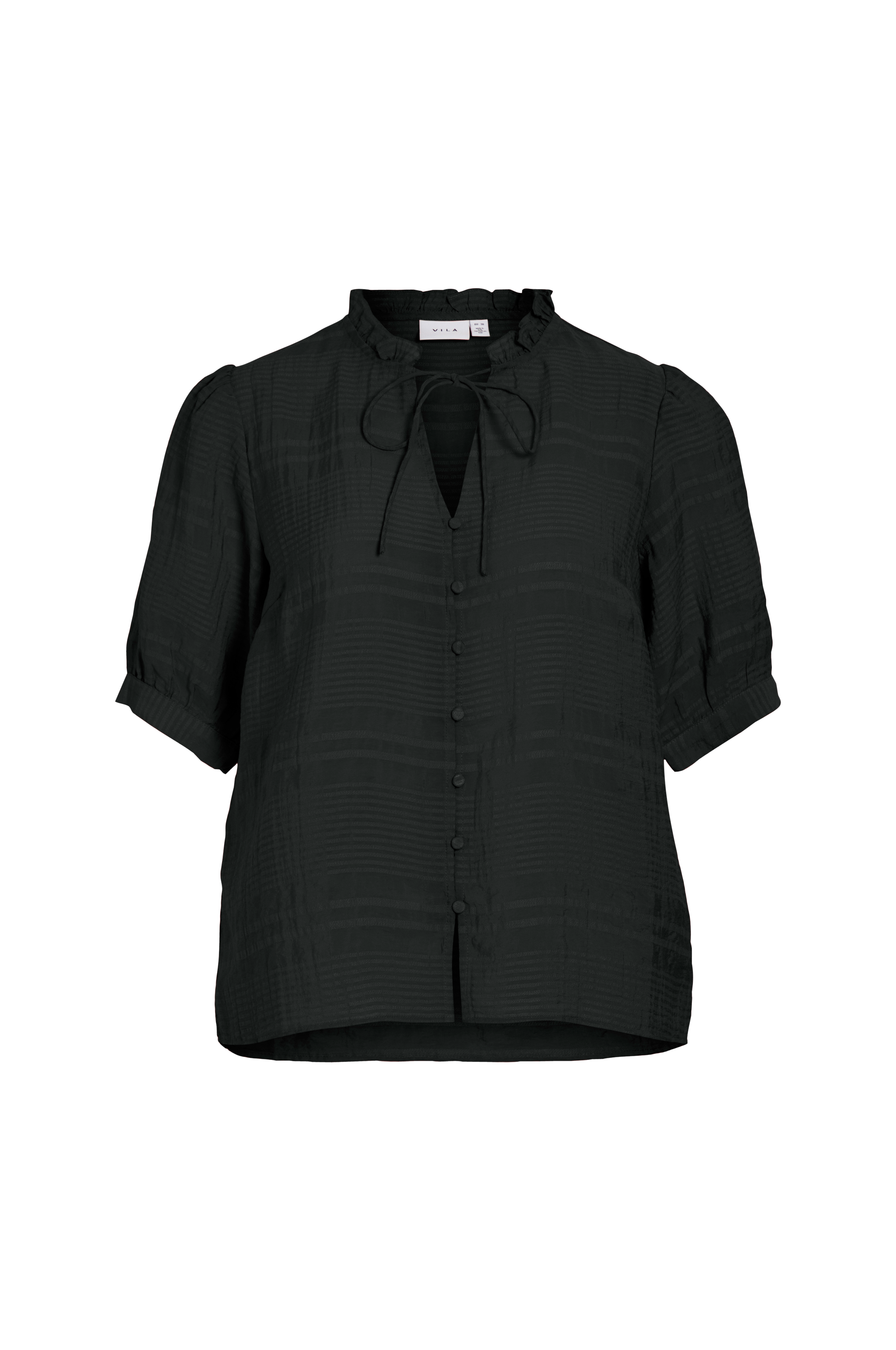 • Kortærmet skjorte i viskoseblanding• Stof med let struktur• Rund hals med flæsekant og bindebånd foran• Beklædte knapper