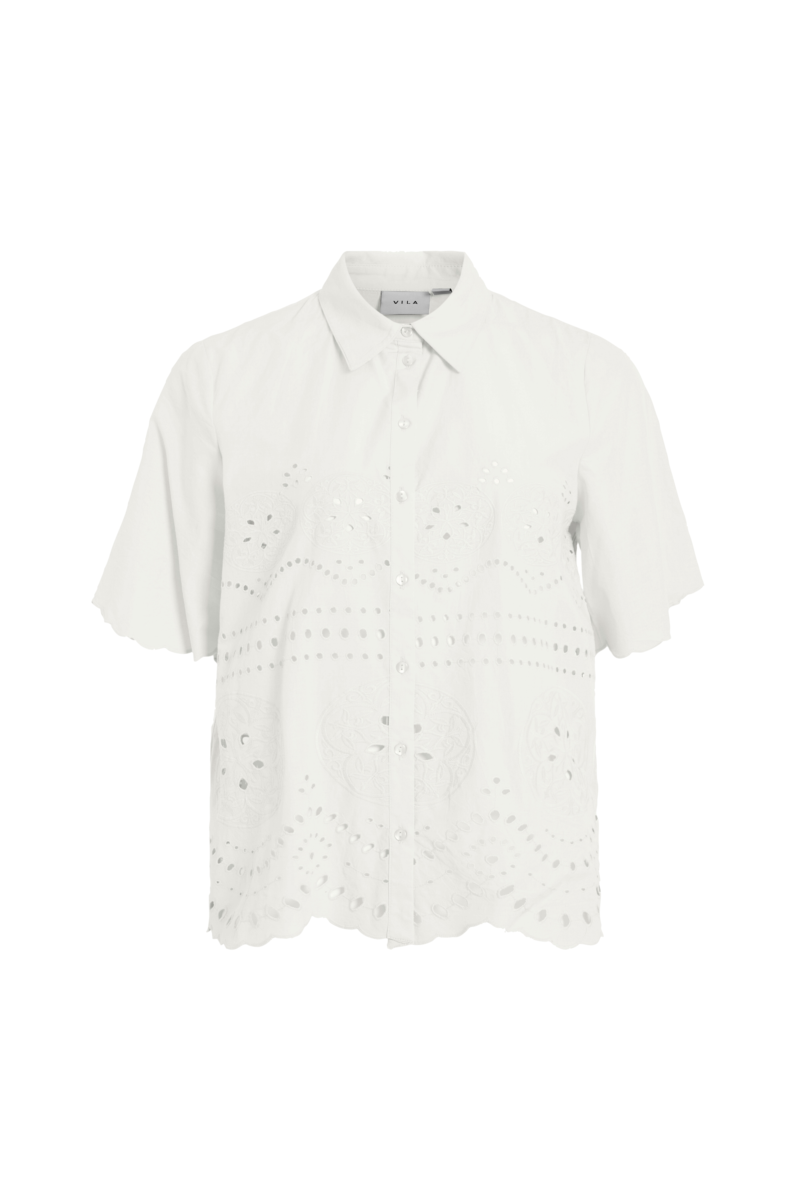 • Lige model med hulbroderier• Lille krave• Kort ærme• Knapper foran• Bølgede kanter ved manchetterne og nederst