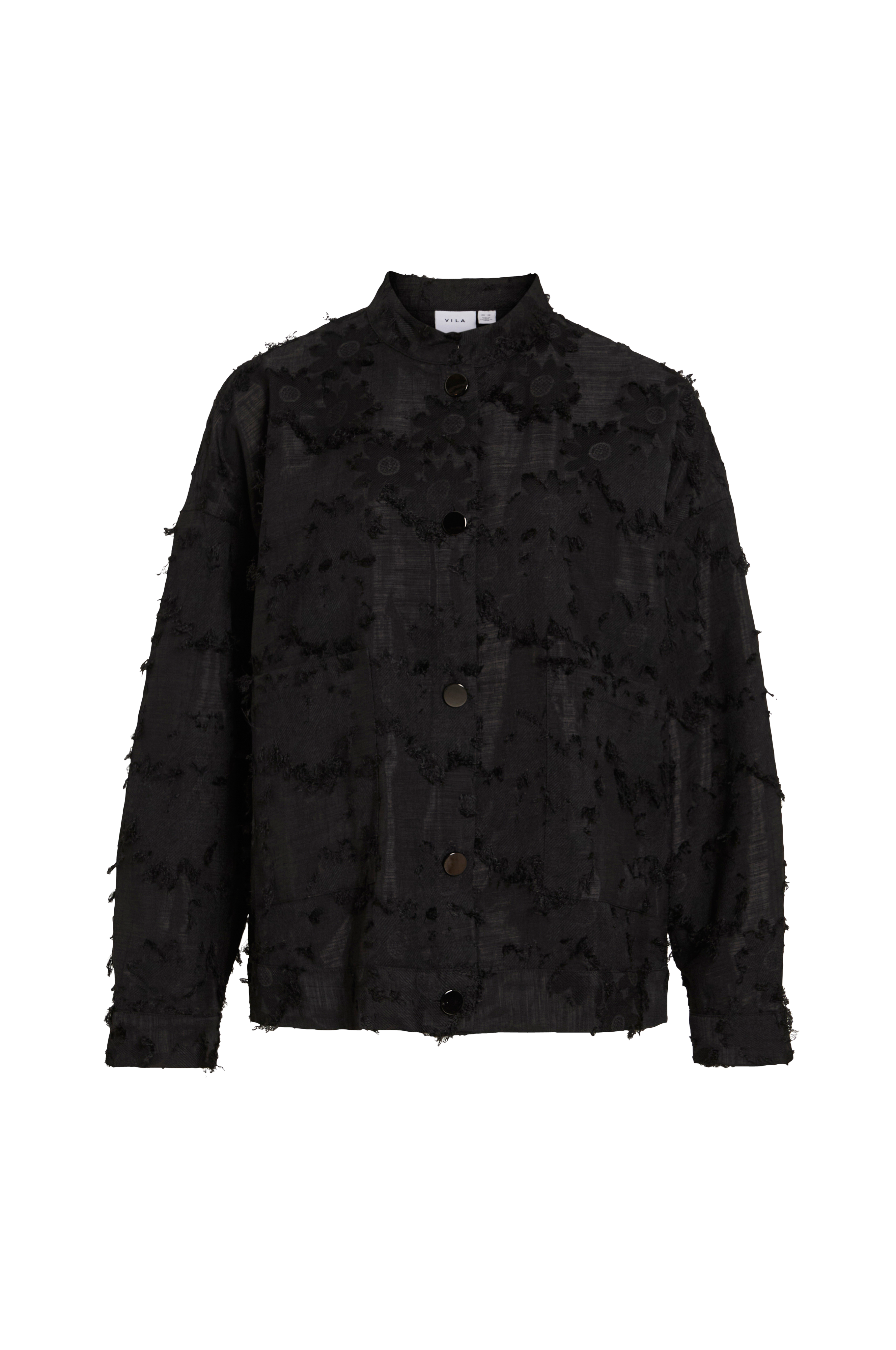 • Bred, lige model med strukturmønster• Rund hals med påsyet kant• Metalknapper hele vejen frem• Nedsænket skulder• Langt ærme med manchet• Store, påsyede lommer• Linning nederst