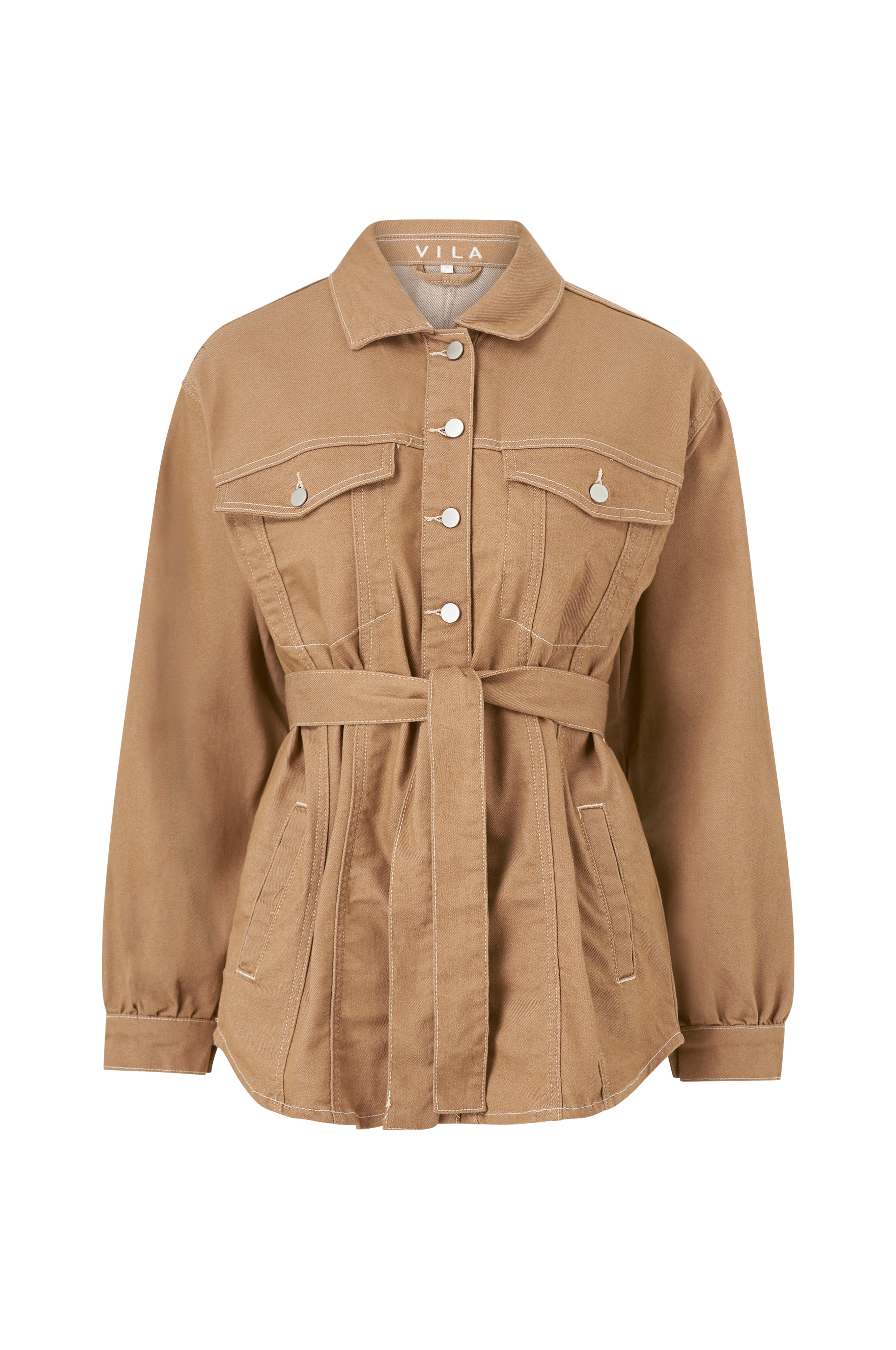 Skjortejakke i oversizemodel med bindebælte i taljen. Pyntestukne sømme og metalknapper foran. To indsatte lommer og to brystlommer med klap. Længde ca. 77 cm i str. 36.