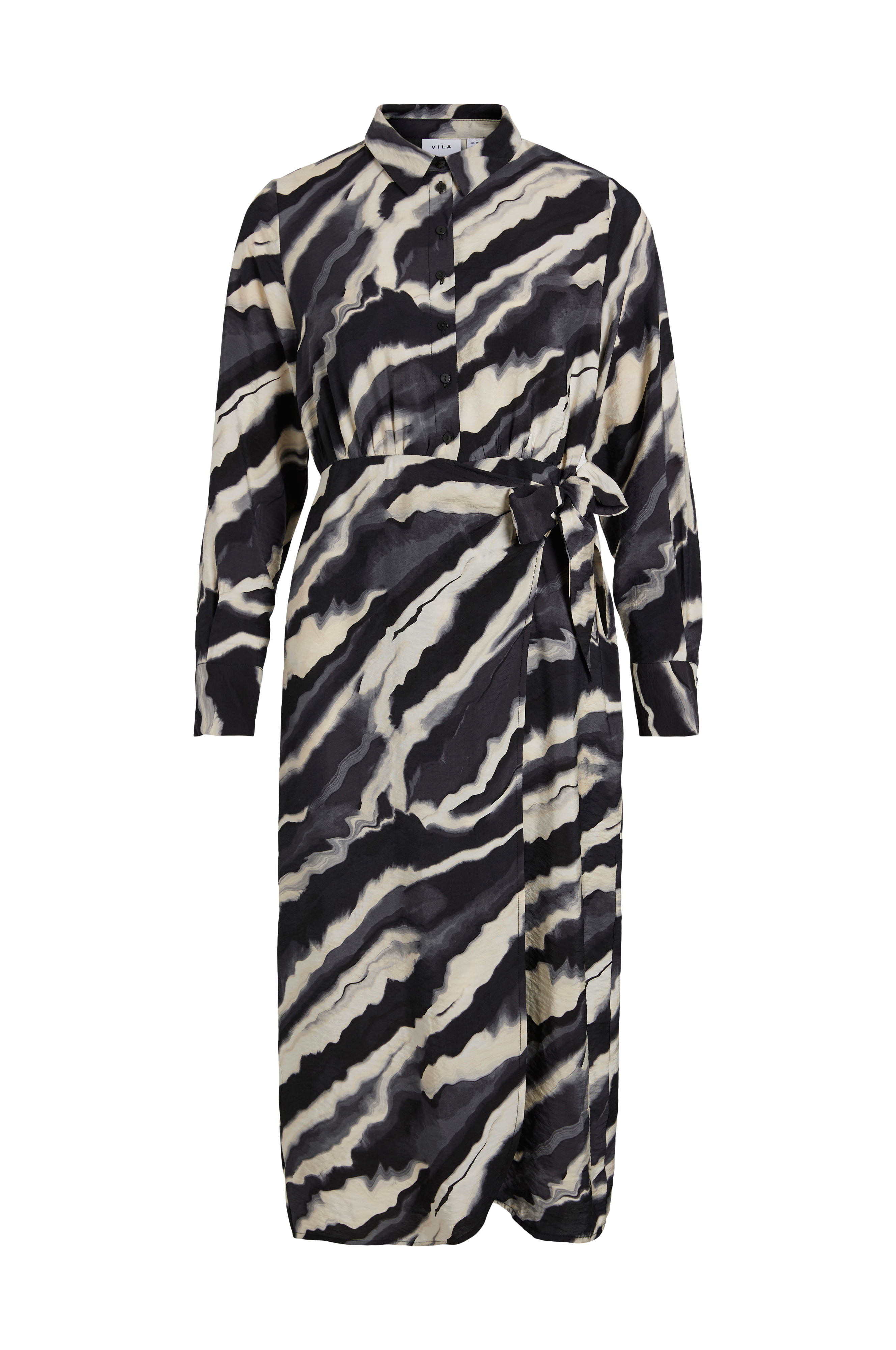 • Mønstret kjole i viskoseblanding• Knapper oppe foran• Slå-om design nederst• Snøring i siden• Længde: 122 cm i størrelse 36
