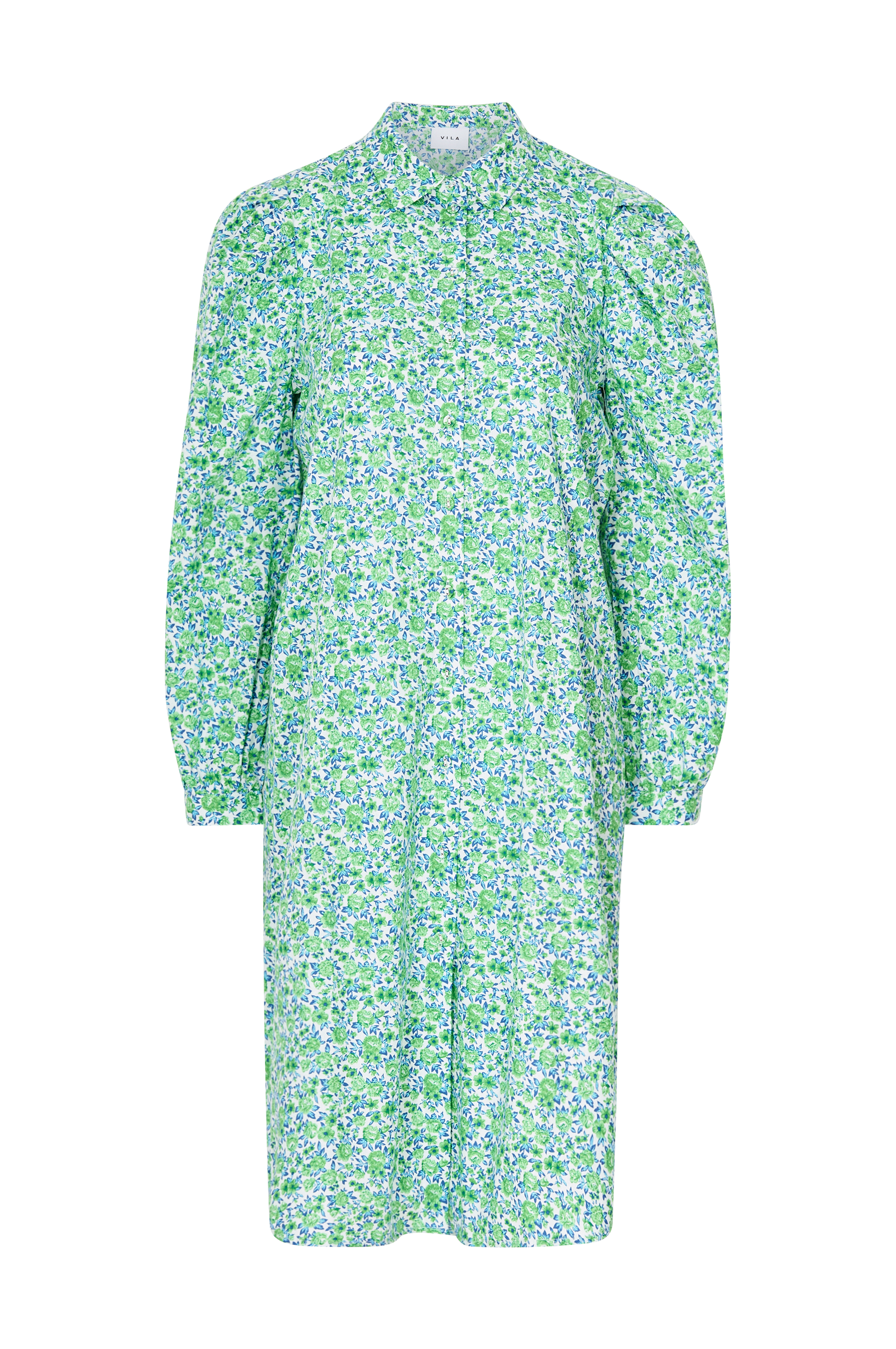 Skjortekjole med knapper foran og lange ballonærmer med pufskulder og manchet. Lige pasform. Aftageligt bindebælte som kan anvendes rundt om taljen eller halsen. Længde ca. 102 cm i str. 36.