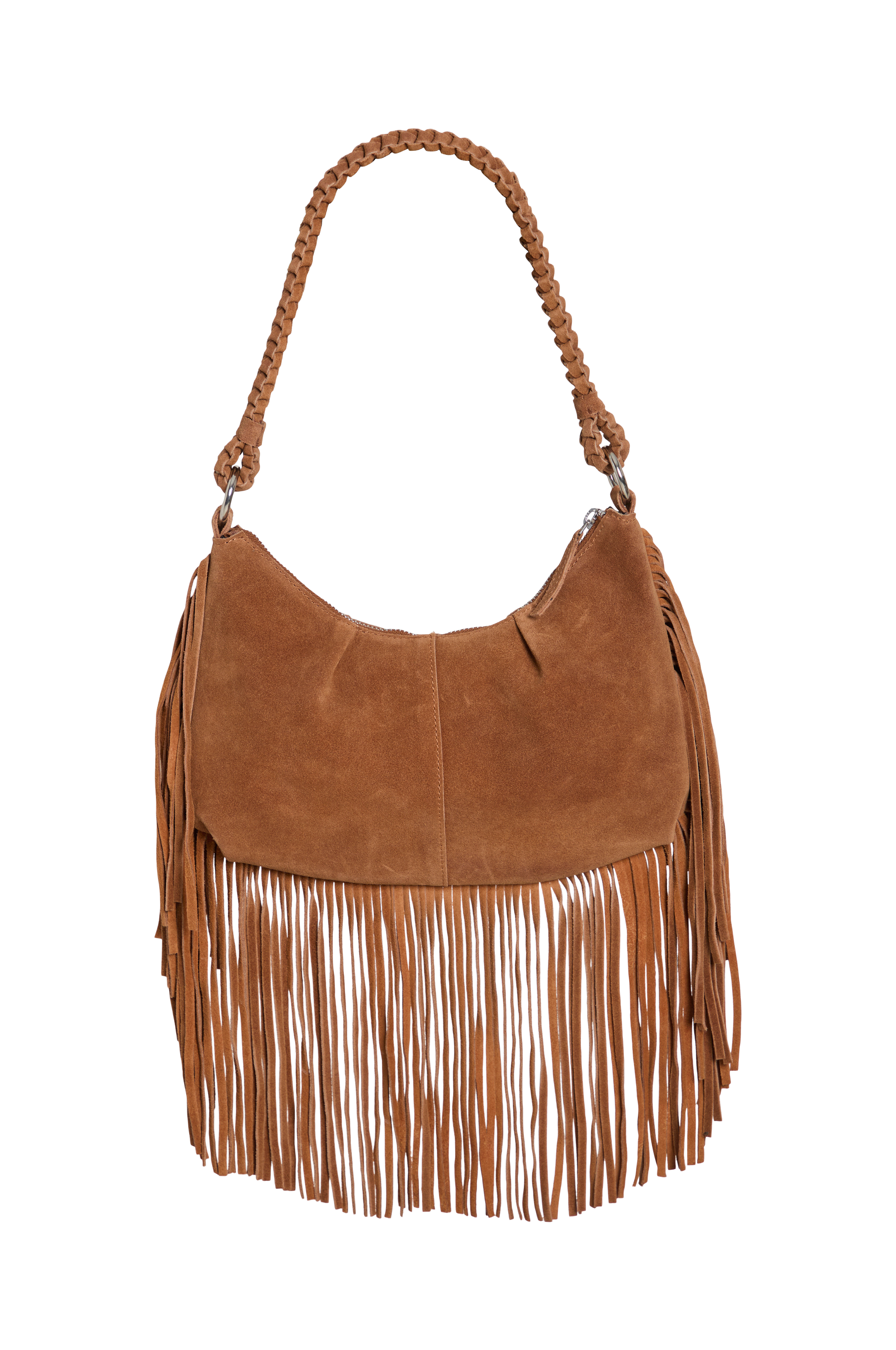 • Taske i ruskind med frynsedetaljer• Flettet skulderstrop• Hovedrum med lynlås• En indvendig Rum med lynlås• Tekstilforing