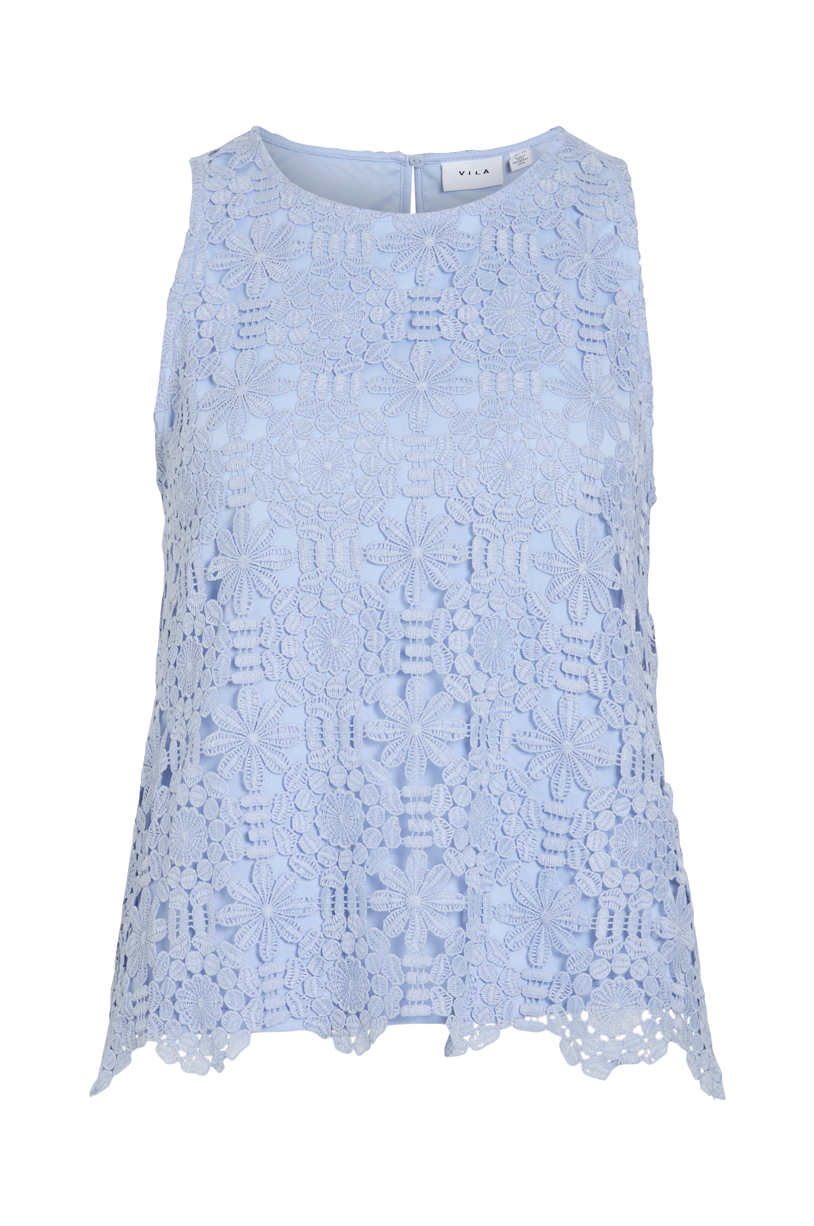 • Ærmeløs model med svaj i blonde• Rund hals med knap i nakken• Bølget søm• Foret