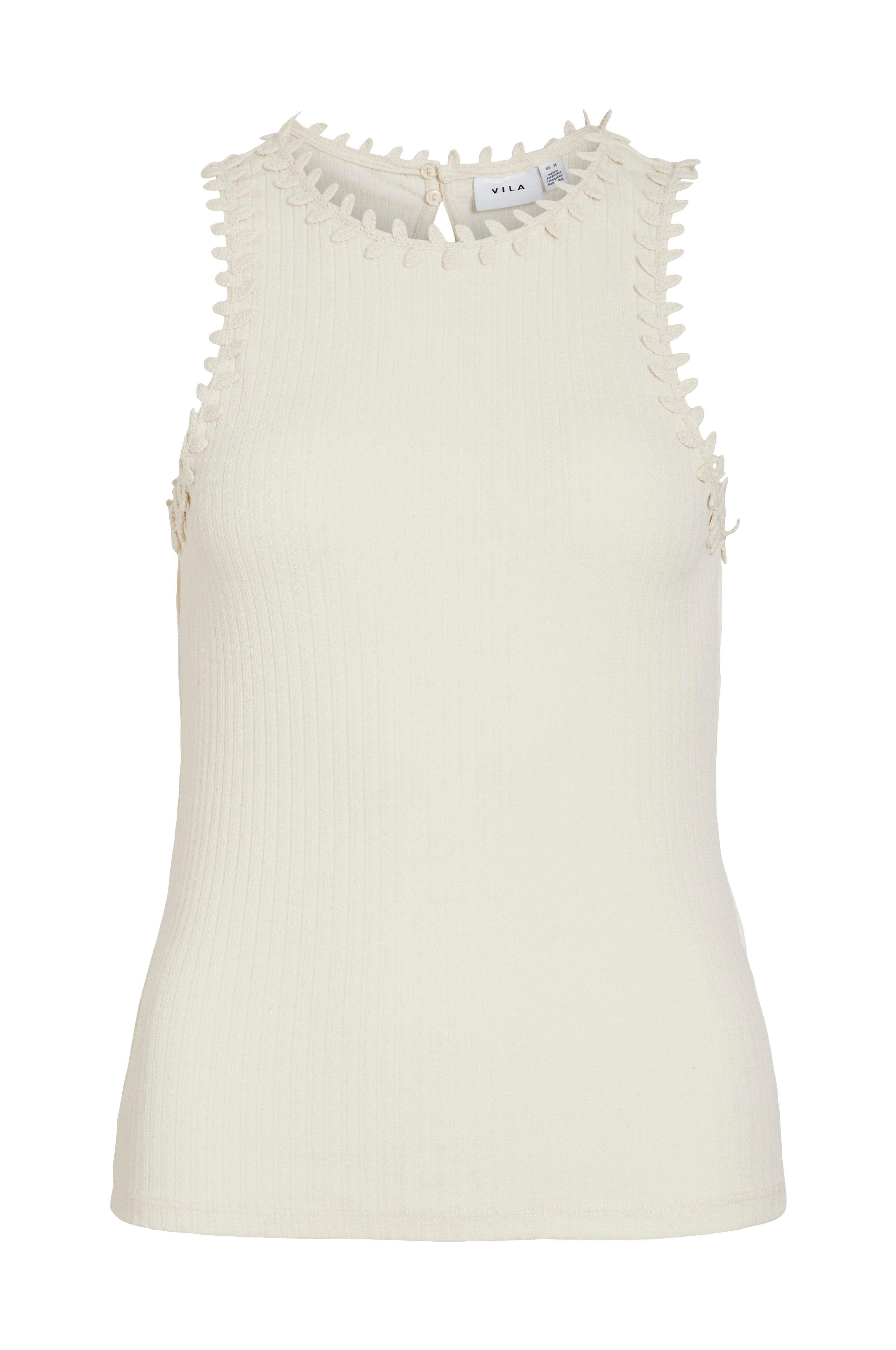 • Top med hæklede detaljer langs udskæringen og omkring ærmeåbningerne• Ærmeløst design• Nøglehulsåbning oppe bagved med to skjulte knapper• Ribbet materiale• Figursyet pasform