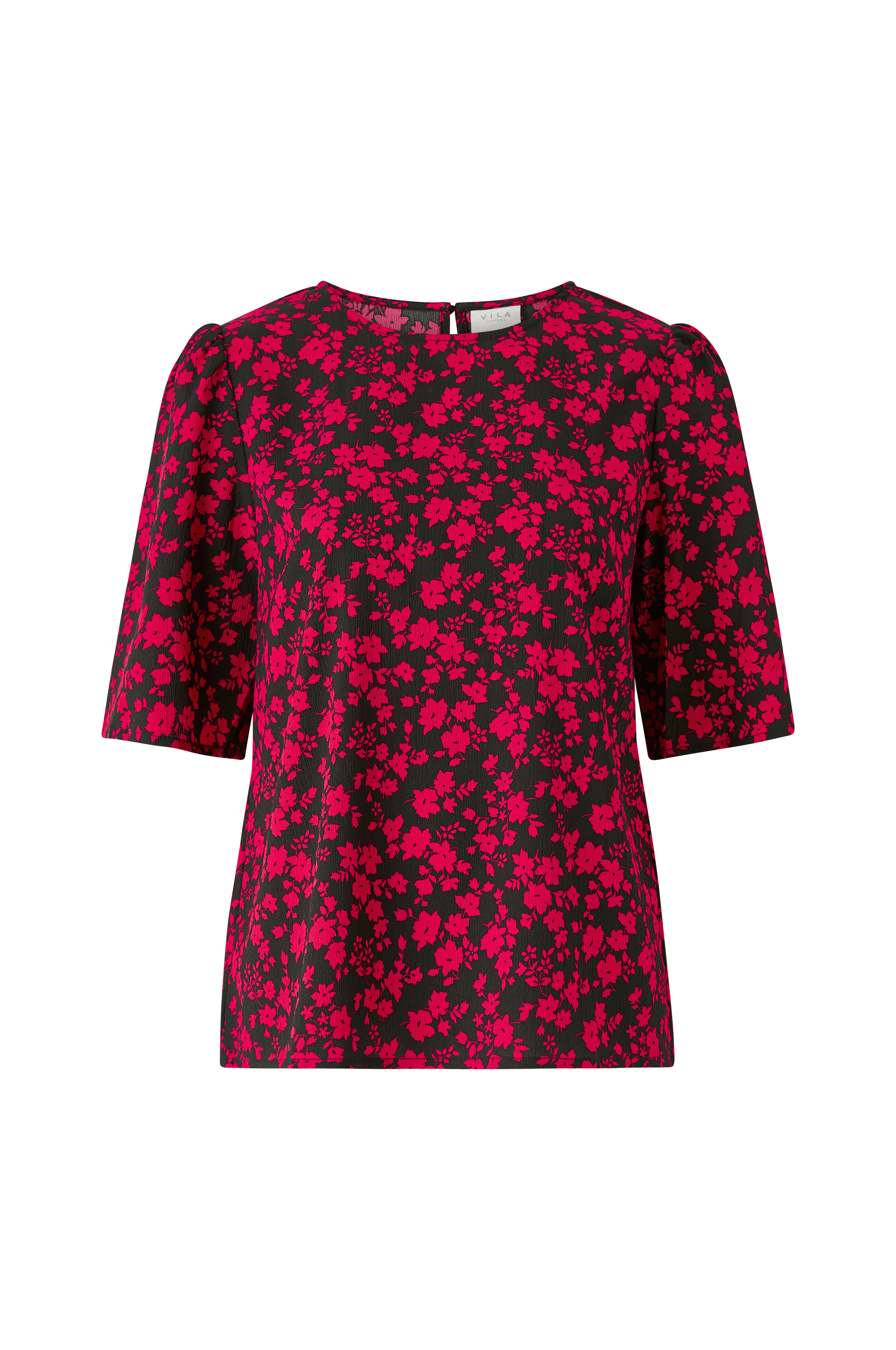 Top viBigga 2/4 Top fra Vila. Lige model med halvlangt ærme som har puf ved skulderen. Rund hals med slids og beklædt knap i nakken. Vævet crepekvalitet med printet mønster.