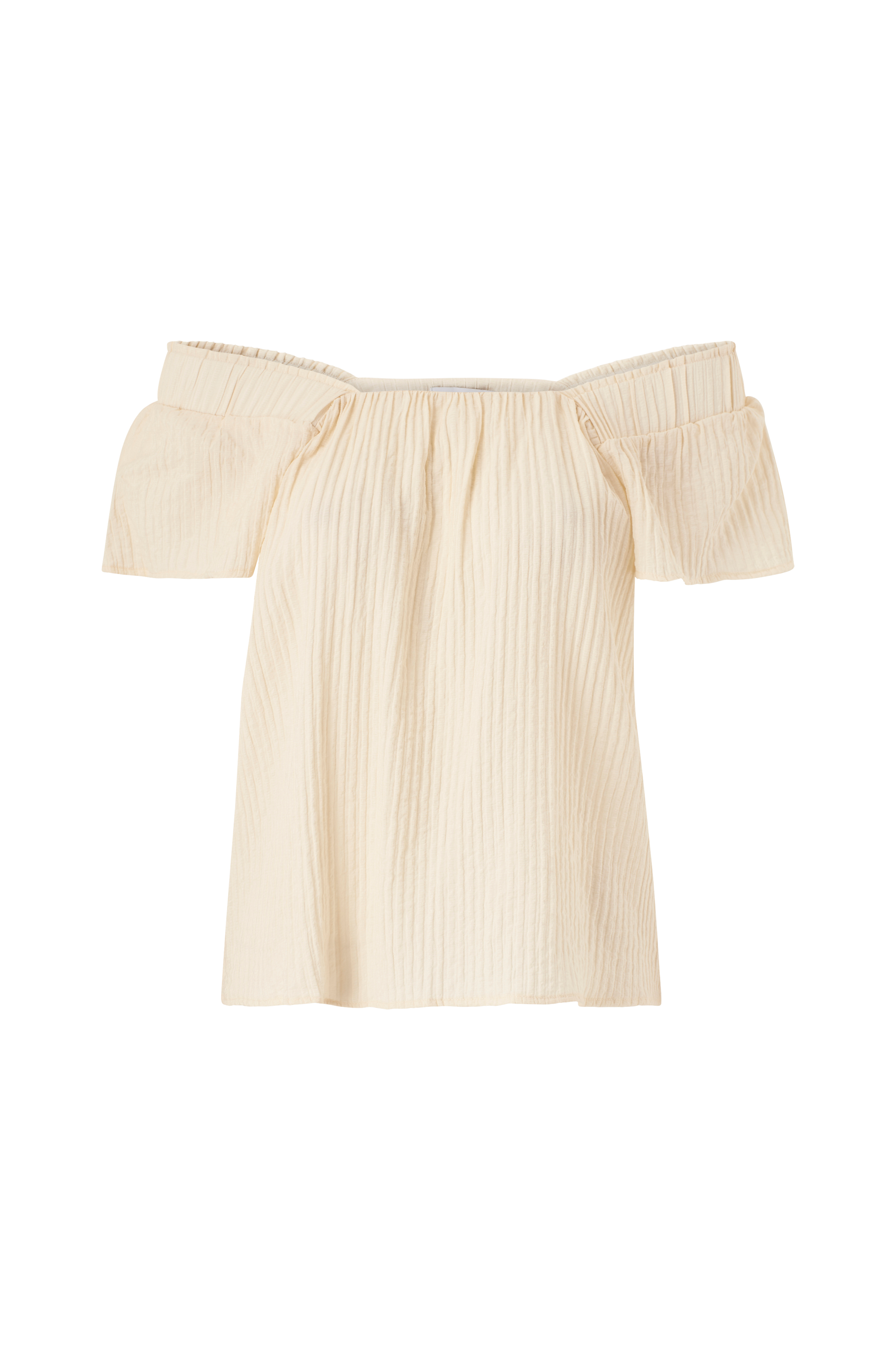 • Model i crepe• Kantet halsudskæring med bredt, indlagt elastisk bånd over skuldrene• Kort, bredt ærme