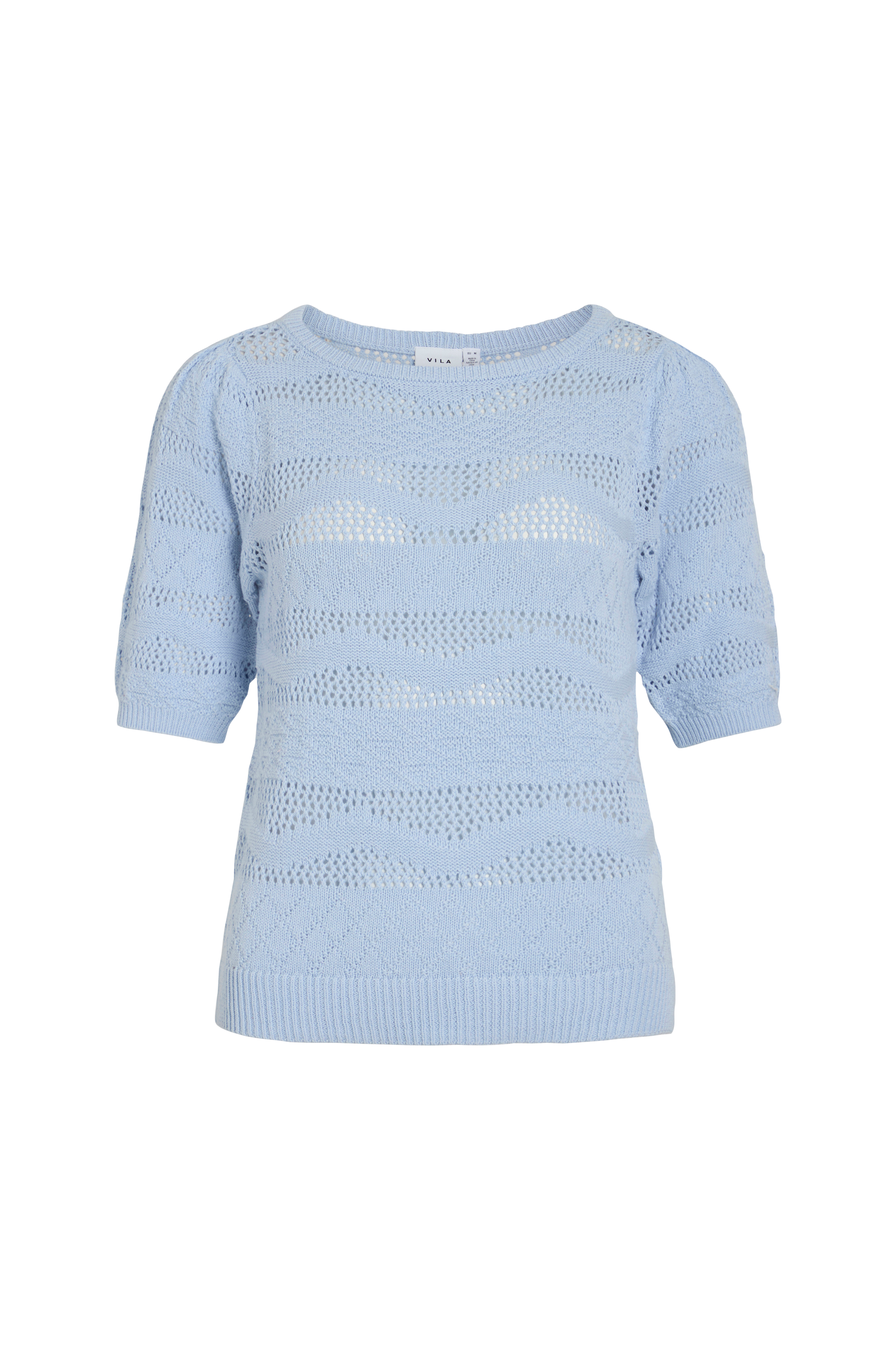 • Lige, mønsterstrikket model• Bred halsudskæring• Kort ballonærme• Ribstrikkede kanter