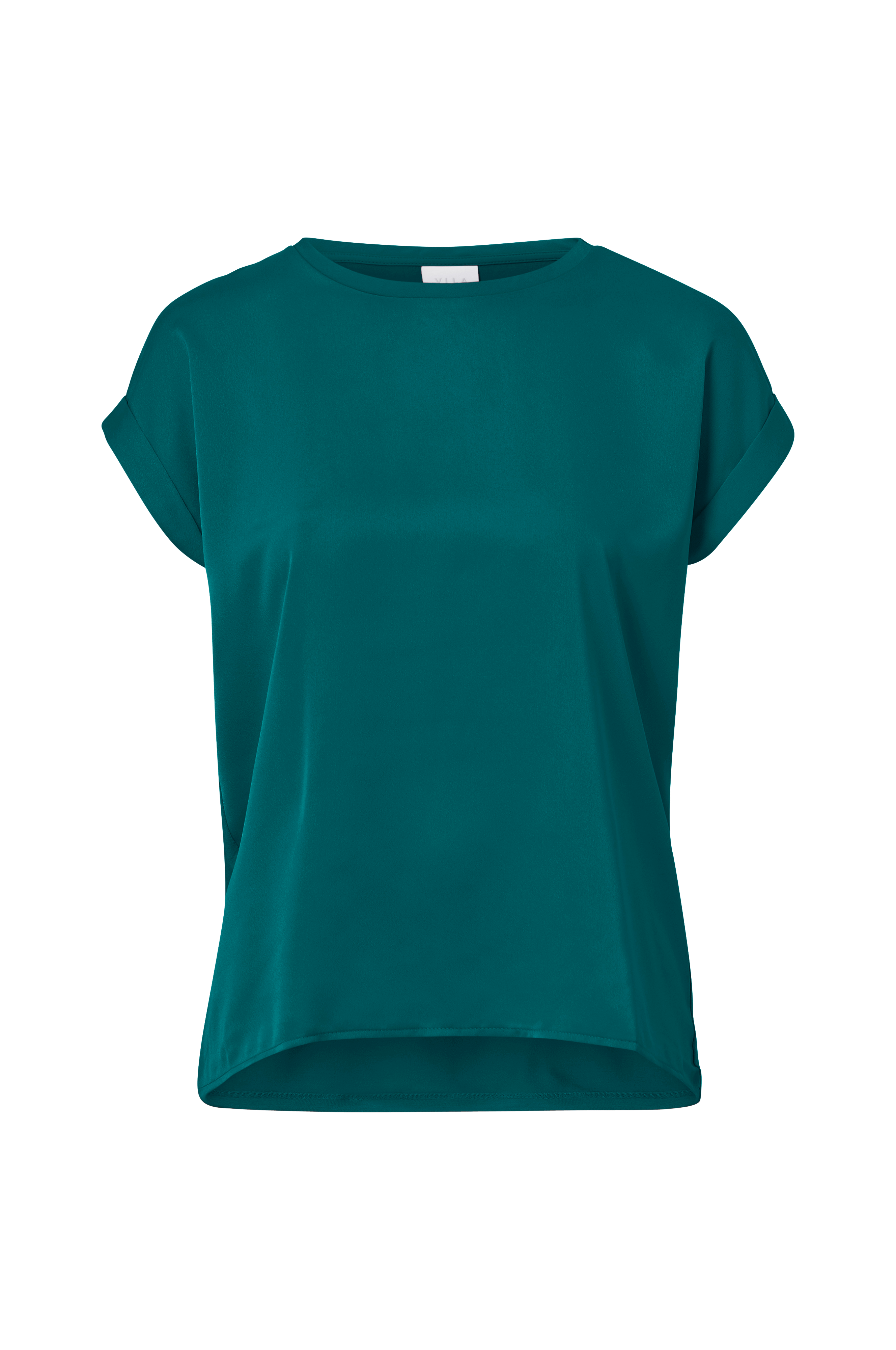 Top med blank forside i vævet kvalitet og bagside i jersey. Korte ærmer med opslag og rund hals.