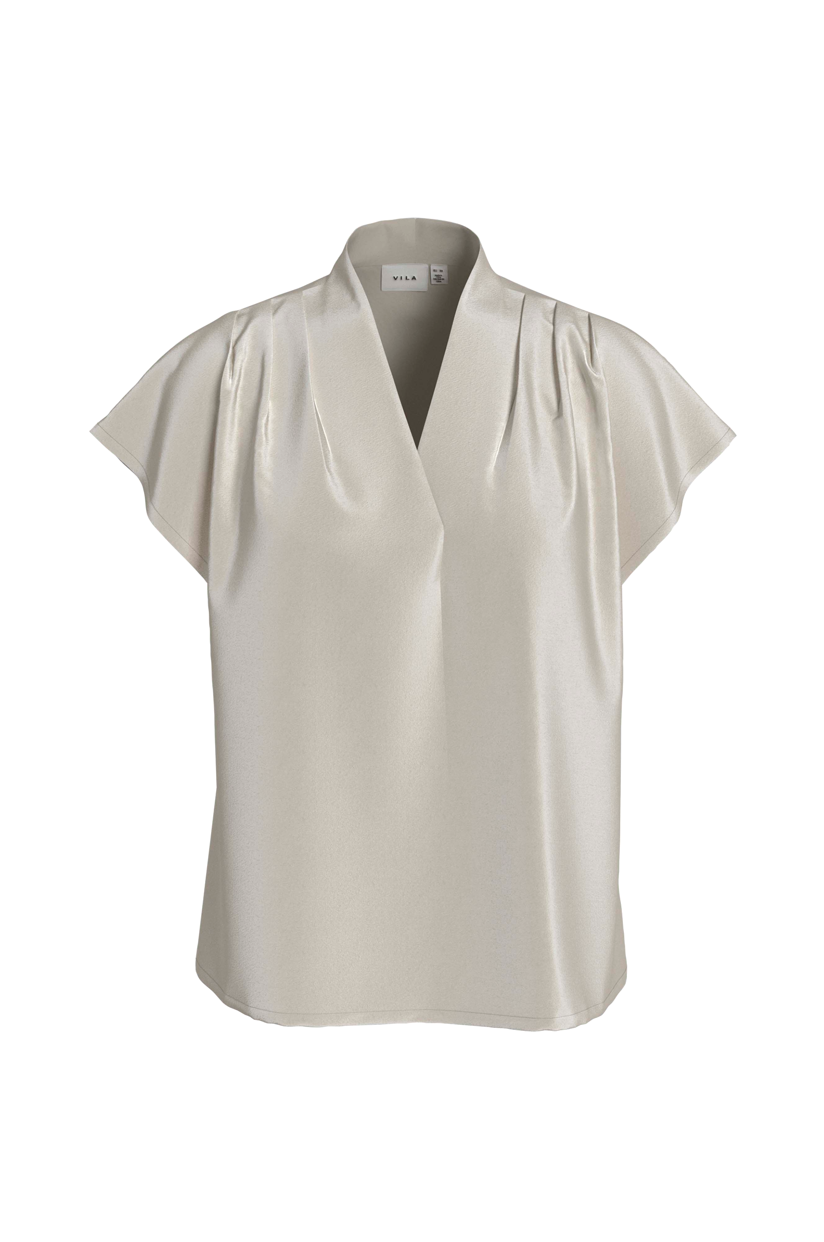 • Lige, uformel model i satin• V-formet halsudskæring• Bokslæg på skuldrene• Kort ærme