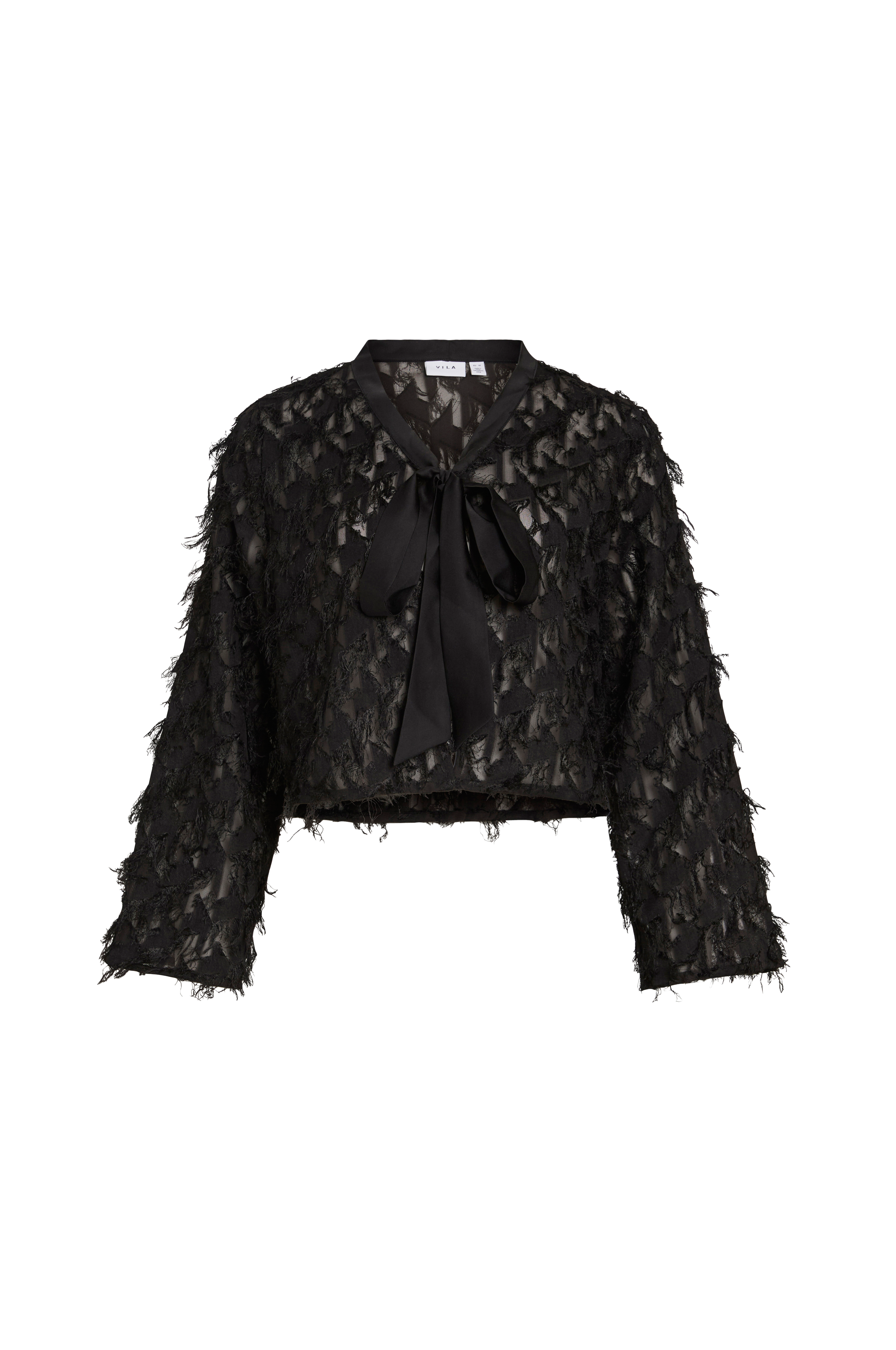 • Kort, lige model i chiffon med tynde frynser overalt• Satinbånd rundt om halsen med bindbart bånd foran• Bredt, langt ærme