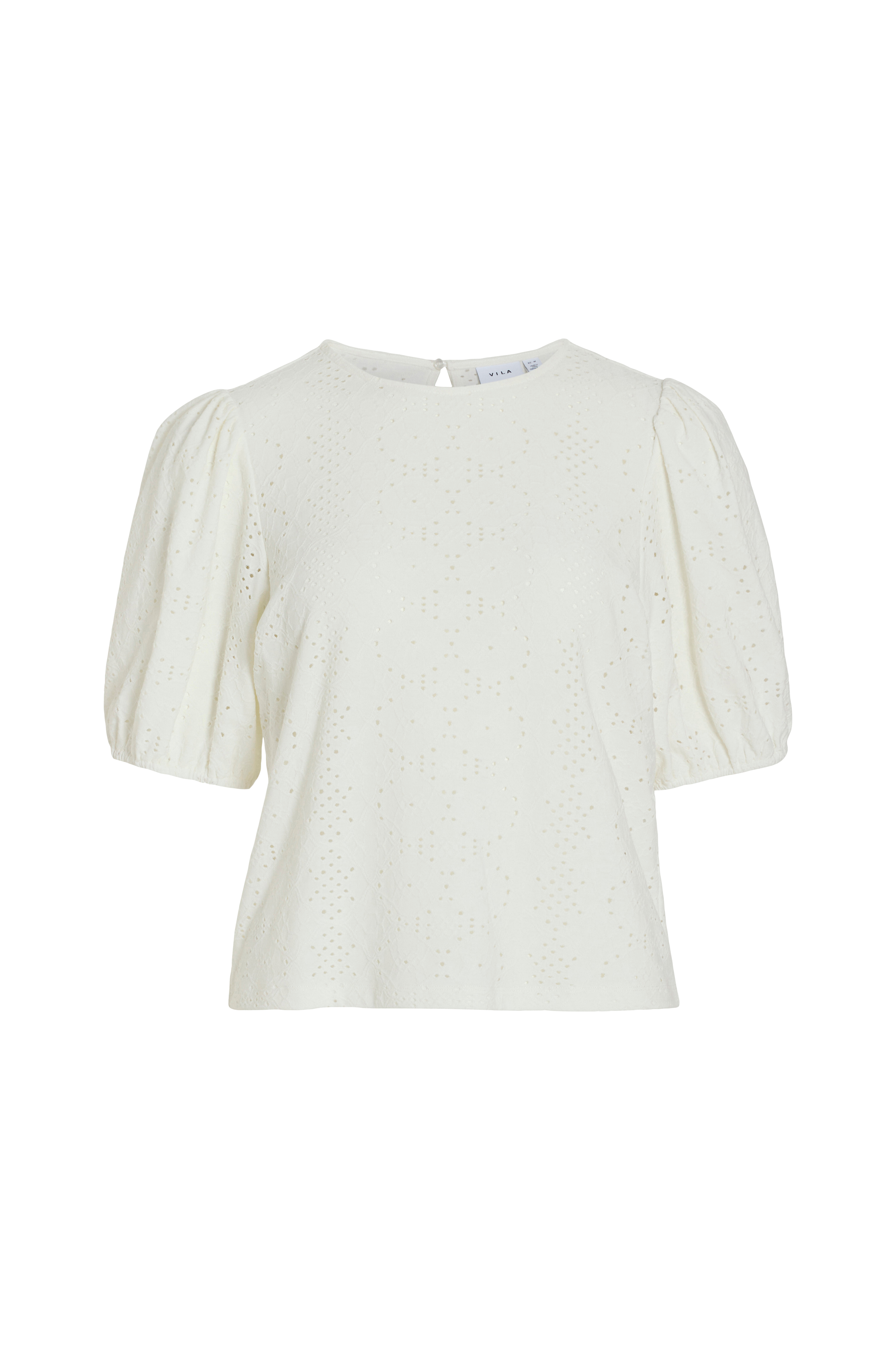 • Elastisk top med hulmønster• Rund halsudskæring• Åbning oppe bagved med knap i nakken• Korte ballonærmer med elastik ved manchetterne