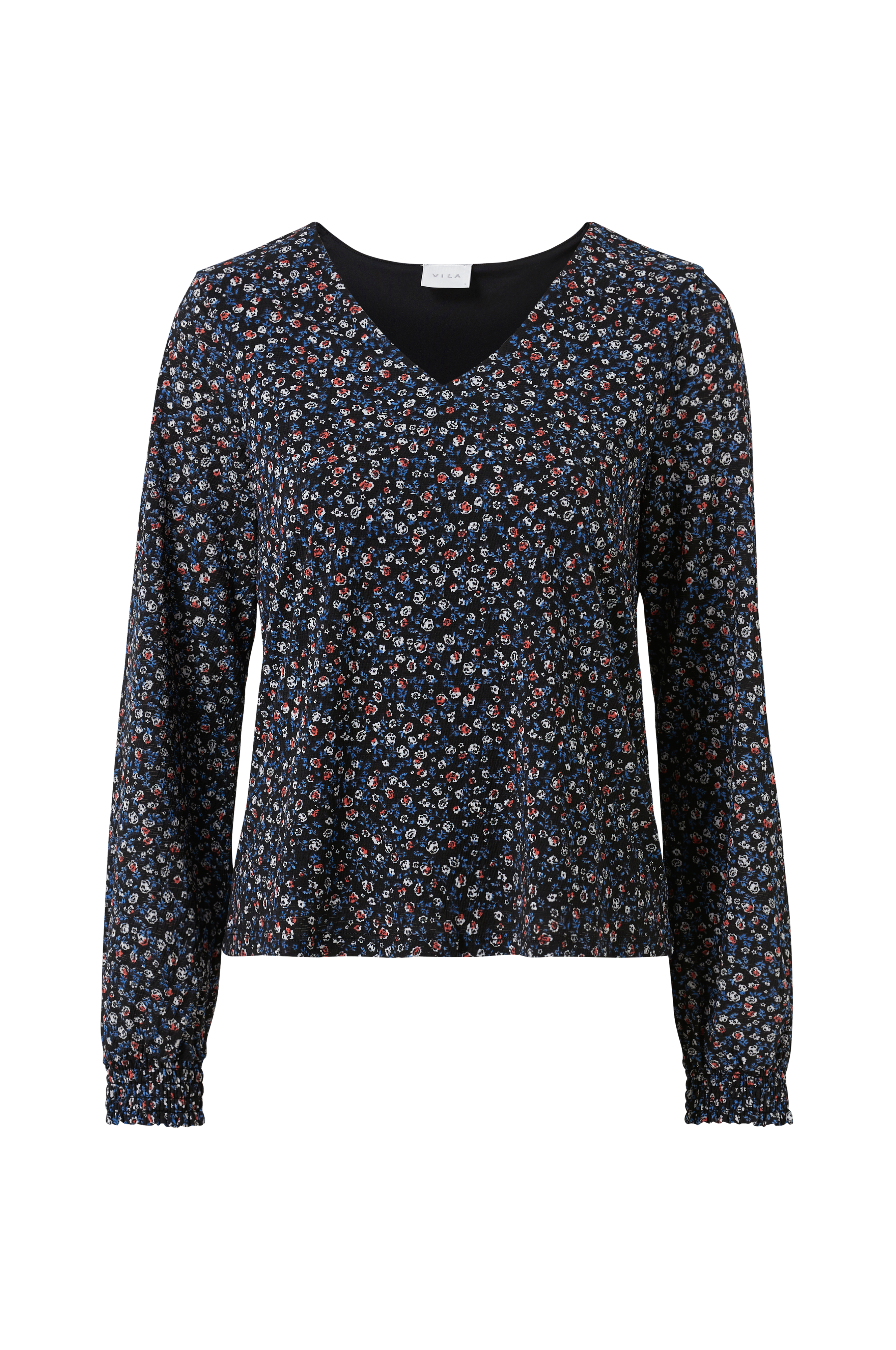 Top viLitin L/S V-neck Top i mønstret jersey med struktur. V-udskæring foran og lange ærmer med smockelastik i ærmekanterne. For i jersey.