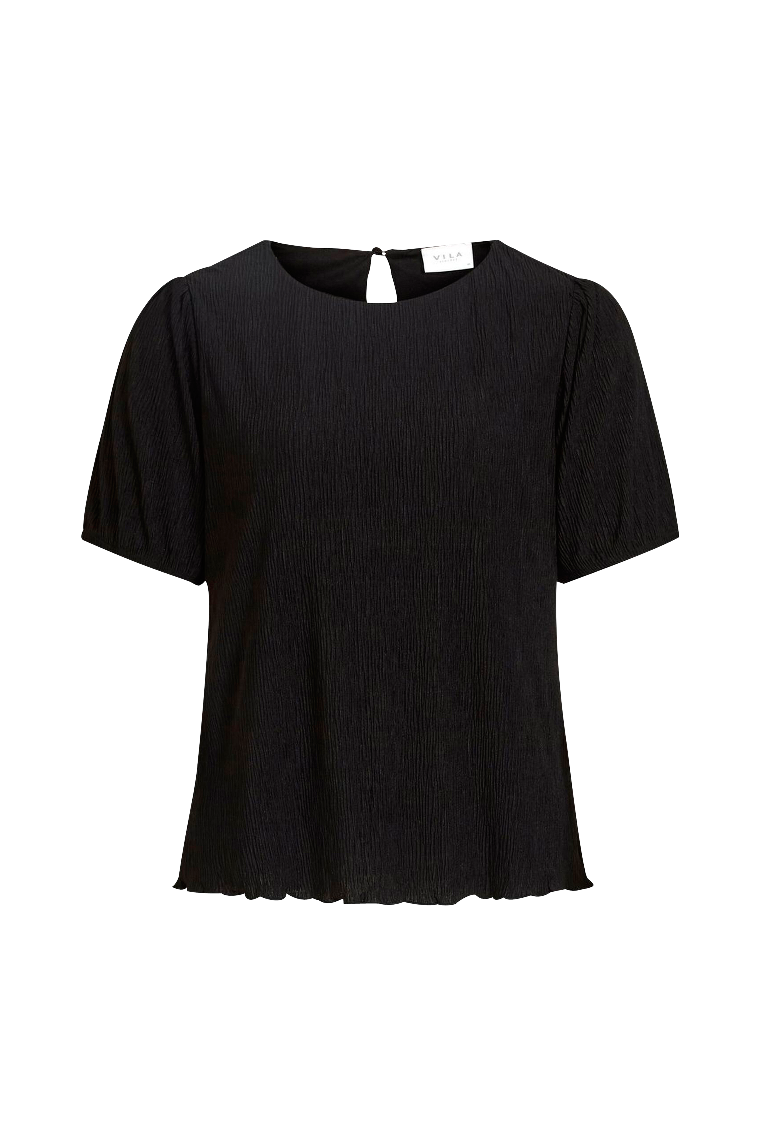 Top viLuta S/S Top fra Vila. Lige model med meget vidde i let blank jersey med smal plissering. Korte, vide ærmer med rynkning ved skulderen og indsat elastik i ærmekanten. Rund hals med slids og beklædt knap i nakken. Foret.