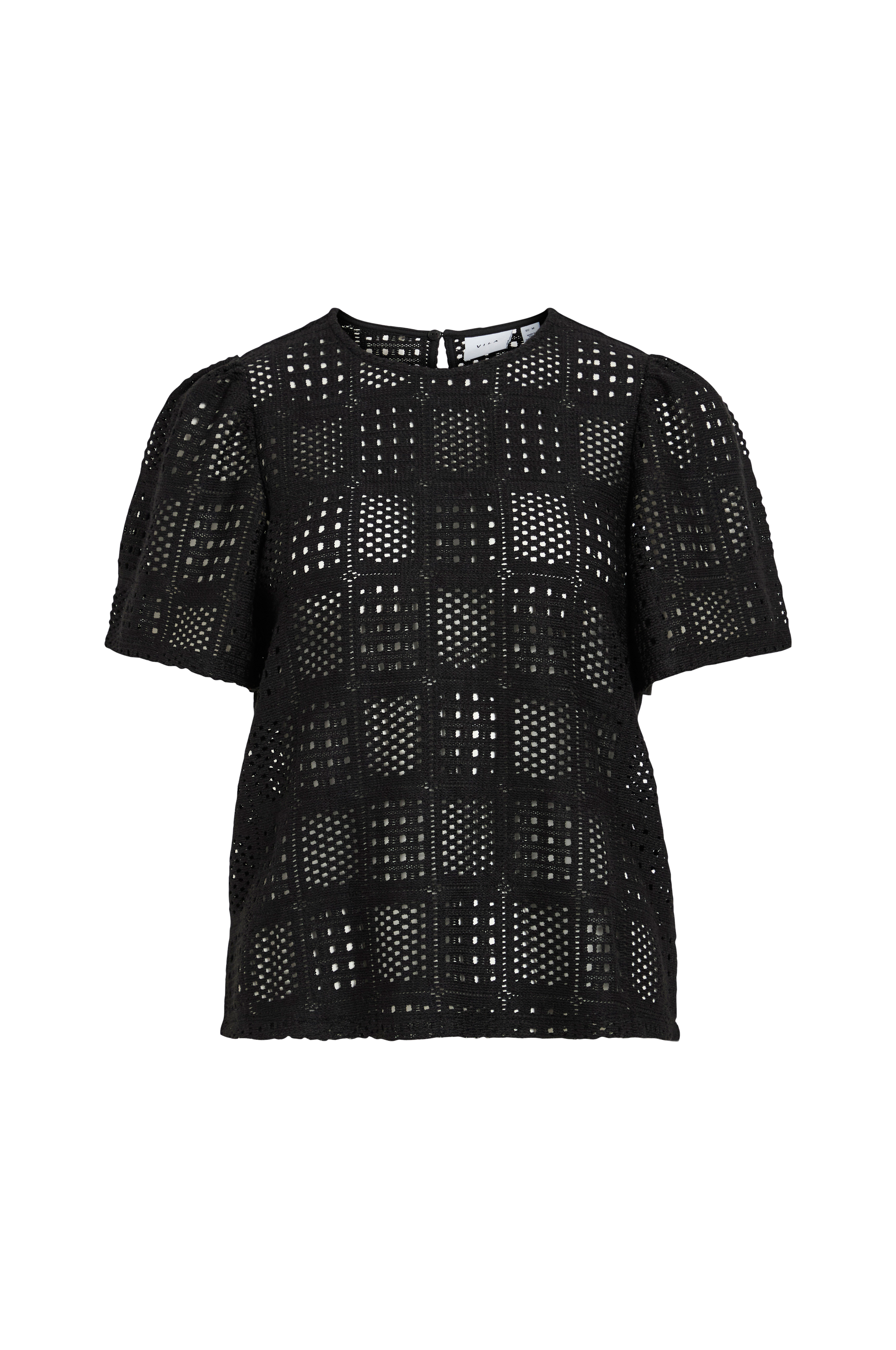 • Strikket top med hulmønster• Rund halsudskæring• Nøglehulsåbning med knap i nakken• Halvlange pufærmer• Semitransparent